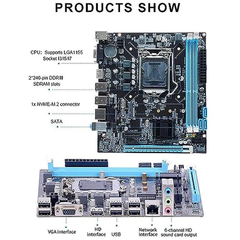 Specification:Item Type: Desktop MotherboardMaterial: Printed Circuit BoardBattery: 240mAh CR2032 Battery (Inbuilt Battery Included) CPU Slot Type: LGA 1155 I3/I5/I7/for Pentium/for Celeron Series CPUStorage: 4 2.0 (3GB/s) PortsLAN: 10/100Mbps LANInput and Output Interface: 6 x USB2.0, 1 x VGA Port, 1 x HD Multimedia Interface Port, 1 x RJ45 Port, 1 x 3 in 1 Audio Port (Line Input/Line Output/Microphone Input)Onboard Interface: 1 x 24Pin ATX Power Connector, 1 x 4Pin ATX 12V Power Connector, 2 x USB Port(Support 4 x USB 2.0), 1 x F Audio Connector, 1 x F Panel Connector, 1 x F Speaker Connector, 1 x Fan Connector, 1 x LPC Debug ConnectorExpansion Slot: 1 x PCI Express X16 Slot, 1 x PCI Express X1 Slot, 1 x M.2 NVMe/NGFF SlotIntegrated Audio: Onboard ALC 6 Channel HD Audio Codec, Provide Front Audio Interface,Front Stereo MicStructure: ATX Structure (17 x 19cm / 6.7 x 7.5in)How to Use:take out and usePackage List:1 xDesktop Motherboard