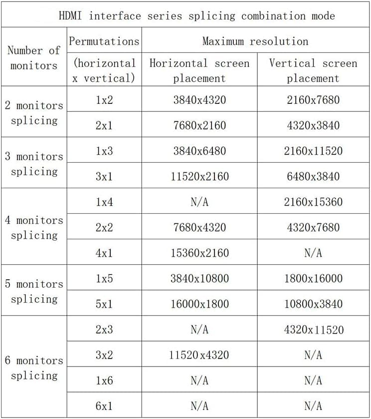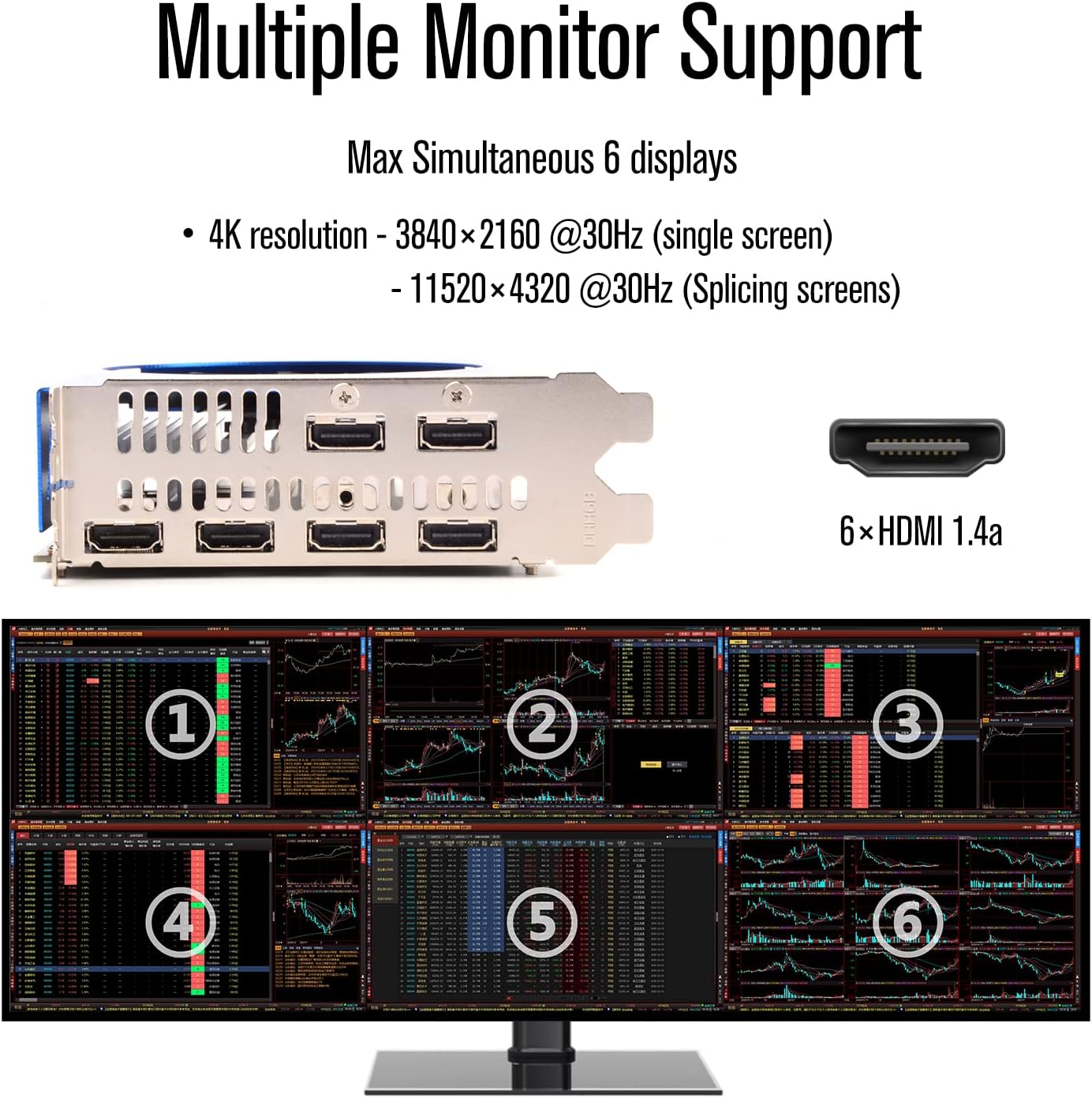 Support for up to 6 Displays: HDMI 4K resolutions 3840×2160 @30Hz(singel screen) ; 11520×4320 @30Hz (Splicing screens)