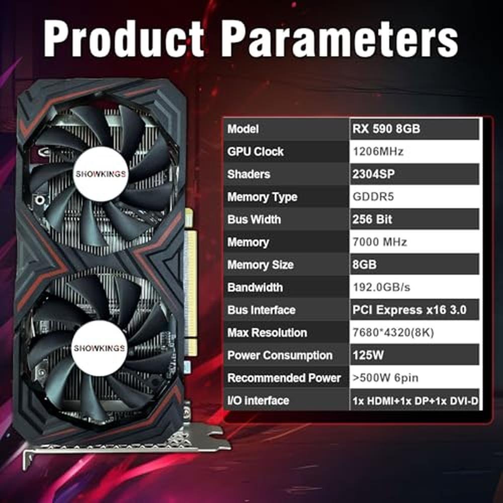 SHOWKINGS Radeon RX 590 GME Graphics Card, 8GB GDDR5 2304SP 256bit 1340MHz GPU Computer Graphics Cards, HDMI DP DVI Interface, Support Up to 8K Video Cards for PC
