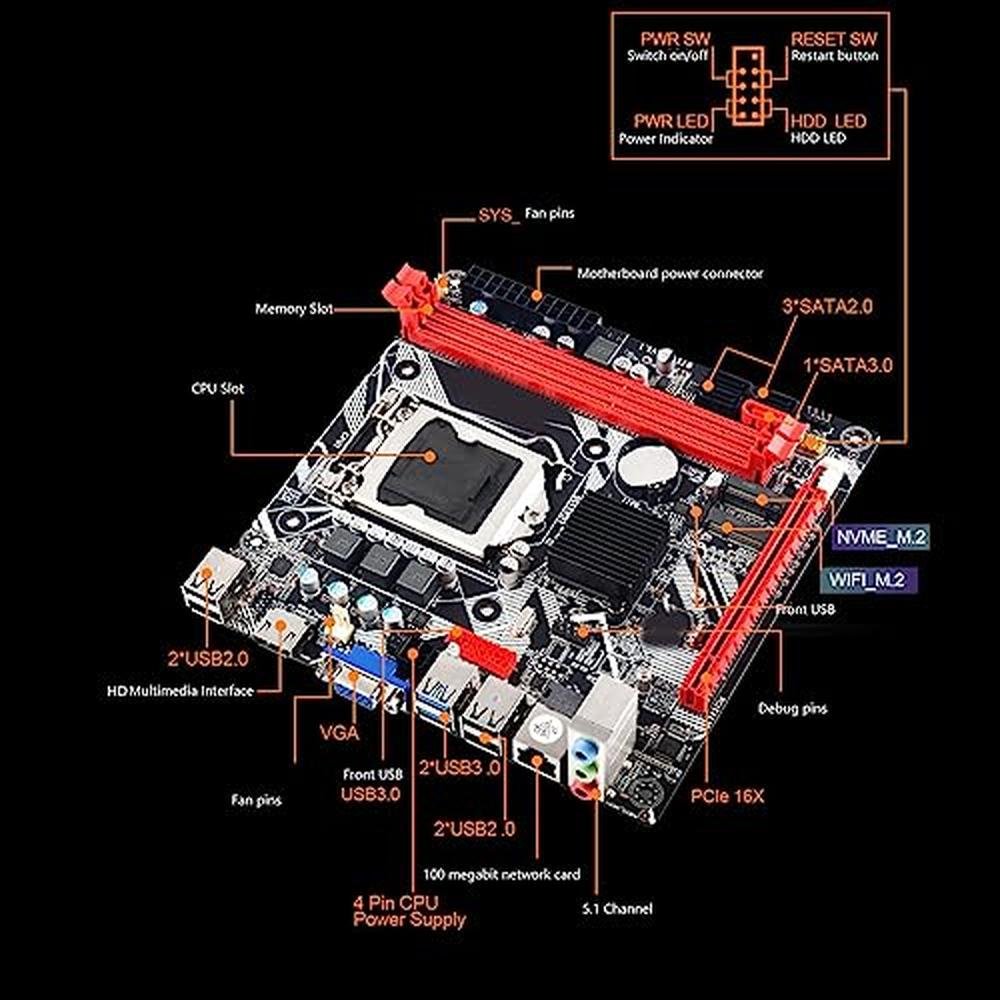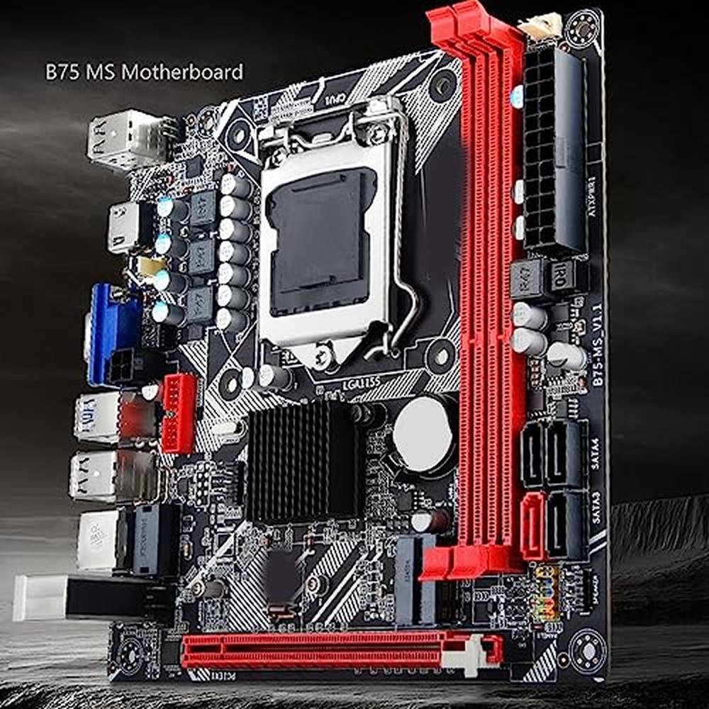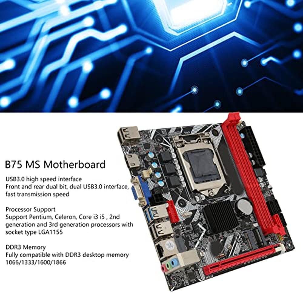 1. USB 3.0 HIGH SPEED INTERFACE: B75 MS computer motherboard has front and rear bits, USB 3.0 ports for fast transfer speeds.2. PROCESSOR SUPPORT: B75 MS motherboard supports for Pentium, for Celeron, Core i3 i5 , 2nd generation and 3rd generation processors with socket type LGA1155.3. DDR3 MEMORY: B75 MS LGA 1155 computer motherboard is fully compatible with DDR3 desktop memory 1066/1333/1600/1866.4. SATA3.0: LGA 1155 motherboard has SATA3.0 high speed hard drive interface, supporting SSD high speed .5. HD GRAPHICS: DDR3 motherboard supports HD high performance graphics cards with VGA and HD Multimedia Interface output.Spec:Item Type: B75 MS Computer MotherboardProduct Material: PCBBuilt in Battery: 1 x CR2032 240mah BatteryMotherboard Model: B75 MSMotherboard Board Type: ITXSound Sound Card: for Realtek ALC662 Sound Card ChipNetwork Card: 100 Megabit Network CardCPU Slot Type: LGA 1155Number of Memory Slots: DDR3 x 2Memory Capacity Peak: 16GBSATA Interface: 1 x SATA3.0, 3 x SATA2.0Graphics Card Slot: PCI E 16XUSB Interface: 4 x USB3.0, 6x USB2.0, 1 x VGA, 1 x HD Multimedia InterfaceExpansion Interface: NVME M.2, M.2How to Use:Install and usePackageList:1 x Motherboard1 x Connection Cable1 x Metal Plate