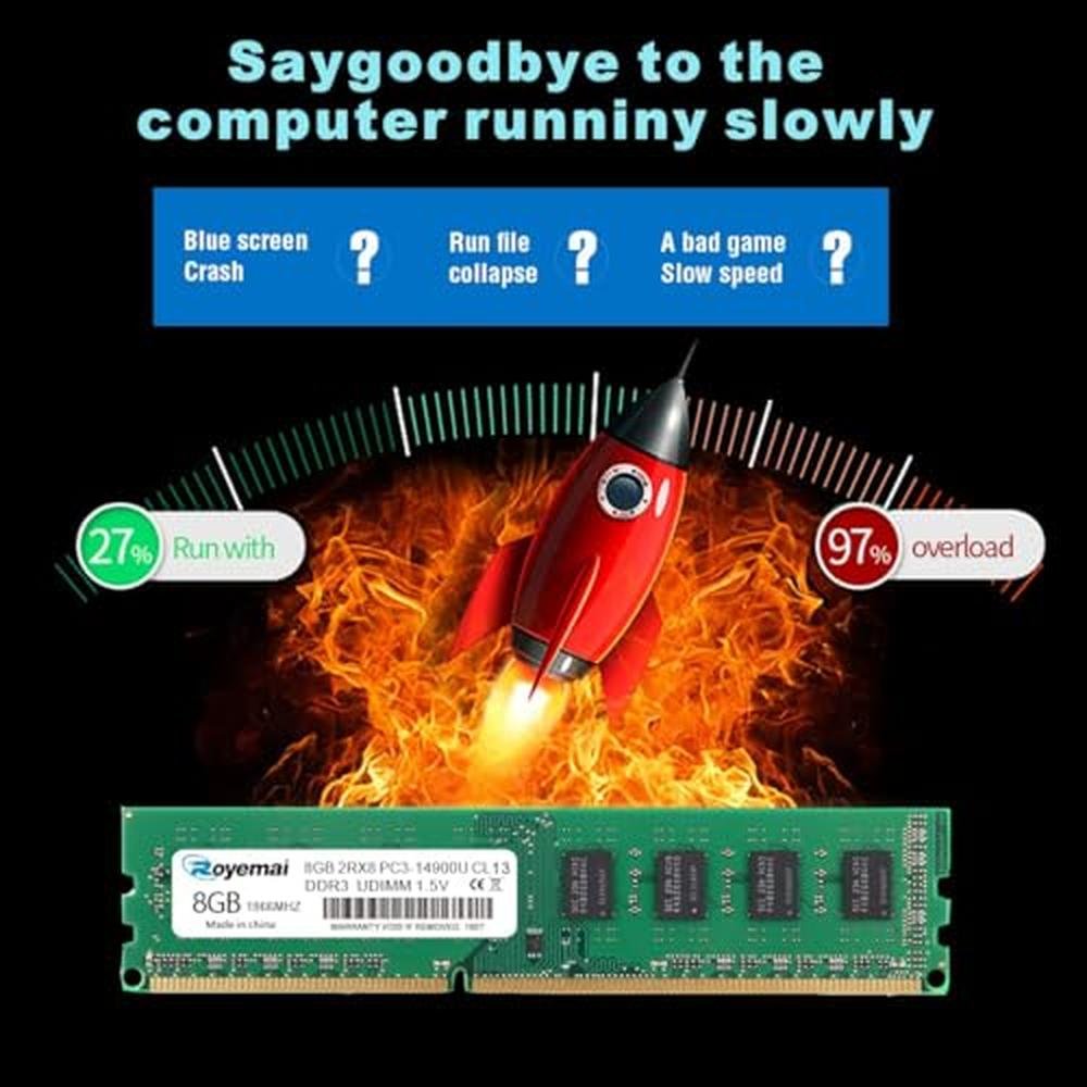Please Kindly Note In case the RAM cannot fit your computer, please ensure the parameters before you purchase, such as the RAM model, RAM slot and maximum memory of your computer. High Stability High-quality originals, strict process. All chips from large ands, through strict testing and screening testing. Advanced electroplating process is applied on the connecting finger will improve corrosion resistance and electrical conductivity. After Long-time burn in test and temperature tolerance test aiming at major system platform, it approves that ROYEMAI memory owns high stability and performance. Faster and Smoother ROYEMAI RAM is designed to helyour system run faster and smoother, one of the easiest ways to improve your system s performance. Load programs faster, increase responsiveness, run data-intensive applications easily and increase your desktos multitasking capabilities. After install larger memory, computer will respond noticeably faster, particularly with lots of windows open. High Compatibility To make sure it ll be compatible with Intel, AMD System well, ROYEMAI RAM has been through compatibility testing with all popular ands of motherboards. Test results show that memory is able to offer superior performance and high stability required during long time operation for any and computer. Common Fault Diagnosis 1. Turn on computer, no display Please try to wipe the connection figure with eraser, don t use Corrosives, such as ethyl alcohol. 2. Windows often boot into safe mode automatically Please try to slow the speed of data read in CMOS setting. 3. Computer crash randomly Please try to slow the speed of data read in CMOS setting. If don t work, use same frequency RAMS.
