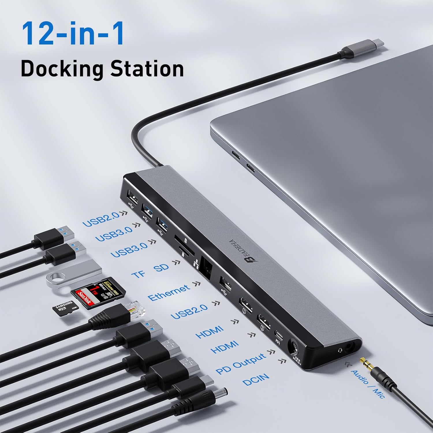 - 12 Ports for Maximum Connectivity: This usb c docking station offers 12 ports for various connections including USB A port *4, USB C port *2, HDMI *2, sd/tf slot, RJ45 Ethernet, and Audio port for earphone, ensuring all your devices can be easily integrated, keeping your desktop neater and cleaner.
