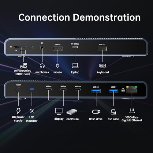 Experience the ultimate in connectivity and productivity with the ACASIS 40Gbps Dock, designed specifically for Thunderbolt 4/3 devices and USB 4 host devices. As a leading brand in innovative devices, ACASIS offers a comprehensive 13-in-1 laptop docking station that transforms your workspace. With the capability to support single 8K60Hz or dual 4K60Hz displays, this dock ensures unparalleled visual fidelity. It features 3x40Gbps ports for ultra-fast data transfer, 2xUSB A 3.1 for peripherals, a Gigabit Ethernet (GbE) port for stable internet, and an SD/TF 4.0 card reader for effortless file management. Additionally, a perfect solution for Macbook air pro and laptops with a port of 40Gbps or USB 3.1 type c, allowing for faster backup, play, and transfer. The USB C docking station supports speeds up to 40Gbps, offering the ultimate combination of speed, performance, and versatility. With a USB C Hub featuring 3x40Gbps, 2xUSB A 3.1, Gigabit Ethernet, SD/TF 4.0, and 3.5mm Audio, this dock is compatible with Windows 7/10/11, Mac OS 10.2 and above, and Linux. The plug-and-play design eliminates the need for drivers, while the upstream interface includes 1xUSB-C All-function Port (PD 60W) and 1xDC Input Port (20V6A). The aluminum alloy body provides superior heat dissipation, making this portable USB Splitter a great space-saving solution for home, office, and on-the-go use.