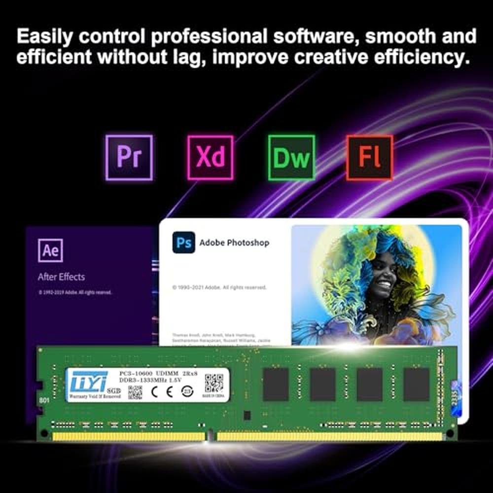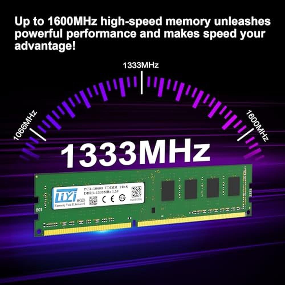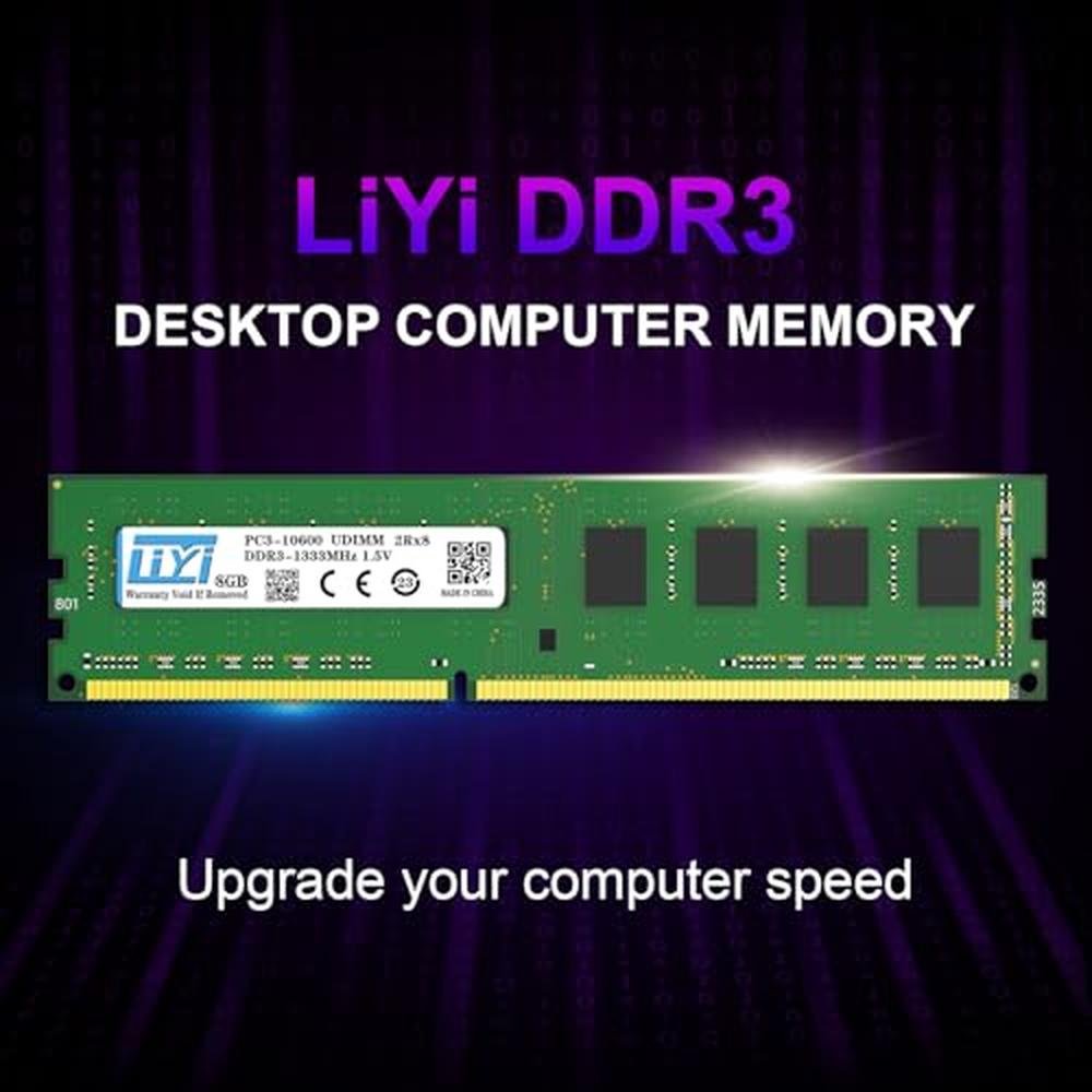LIYI PC Memory RAM and LIYI Module Type DDR3 240 Pin Non-ECC Unbuffered UDIMM Capacity 8GFrequency 1333MHz (PC3-10600) nbsCAS Latency CL9 Voltage 1.5V Form Factor 240-Pin UDIMM Color Green Size 5.25 1.18 inch Single weight 0.6 ounce Supercharge your desktoPC s performance with LIYI Computer Memory s top-of-the-line DDR3 UDIMM RAM modules. Our cutting-edge memory technology is meticulously crafted for seamless compatibility and optimized efficiency, ensuring a smoother computing experience like never before. Discover the power of LIYI Memory s high-quality DDR3 RAM, specially engineered to elevate your desktoPC s performance and reliability to new heights. Experience lightning-fast speeds, low latency, and superior heat dissipation, making every task, from everyday computing to demanding applications, a eeze. Each LIYI RAM module undergoes stringent testing using MemTest86 to ensure unrivaled quality and stability. Crafted from the finest high-quality components, our memory modules provide unparalleled performance and reliability, promising to deliver exceptional results every time. Put your trust in LIYI Memory, the leading and in advanced memory technology. With our lifetime warranty and premium five-star customer support, your peace of mind is our priority. Upgrade your desktoPC effortlessly with LIYI Memory and unlock a world of smoother multitasking and faster data processing. Elevate your computing experience today and choose LIYI Memory for unparalleled performance and reliability. p