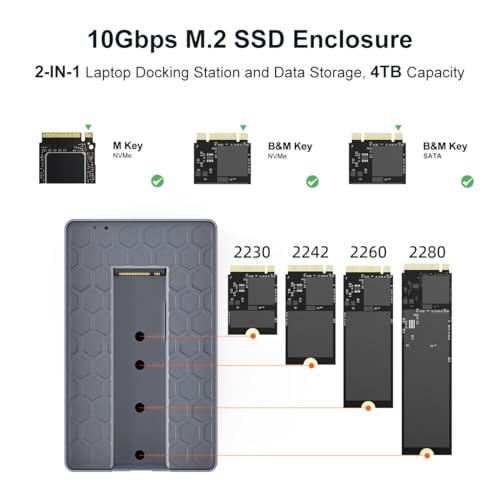 - Features 10Gbps M.2 NVMe SATA SSD Enclosure for fast data transfer and storage expansion, supporting M.2 NVMe SATA SSD in sizes 2230, 2242, 2260, 2280
