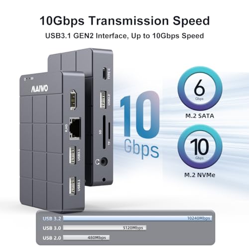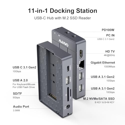 The MAIWO USB C Hub features a 10Gbps M.2 NVMe SATA SSD Enclosure, 11-in-1 Laptop Docking Station with 4K HD-MI, 100W PD, 1000Gbps Ethernet, USB3.1 GEN2, SDTF Card Reader, and a 3.5mm Audio Port, providing a comprehensive solution for all your expansion and connection needs. With its PD 100W fast charging port, 4K HD video interface, 10Gbps USB-C 3.1 GEN2 port, 2X 10Gbps USB-A 3.1 GEN2 ports, USB-A 2.0 port, 1000Mbps Gigabit Ethernet, and 3.5mm audio port, as well as an SDTF card reader, this docking station is the epitome of versatility and functionality.