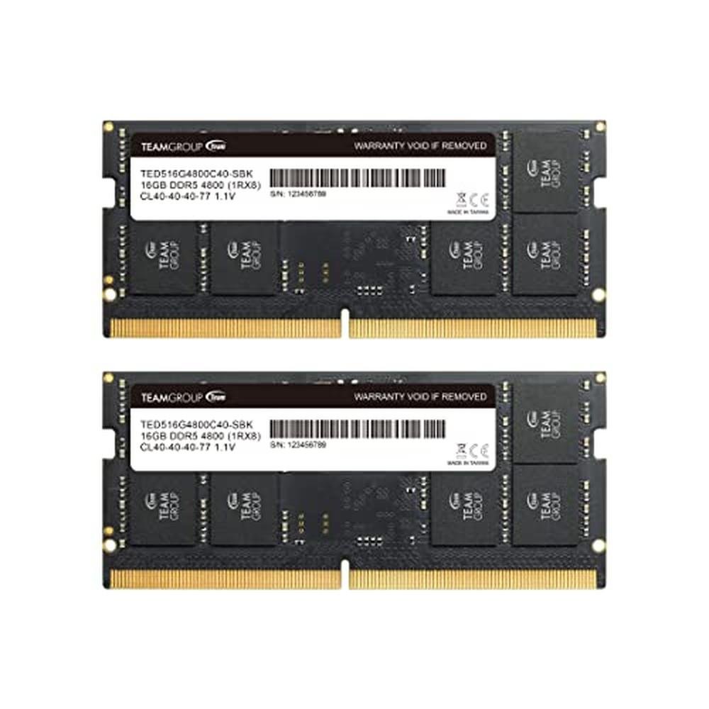 If you are a gadget lover, our Electronics catalog is your dream destination. Choose from hundreds of gadgets and accessories to suit different uses and add some entertainment, facility and convenience to your life.Specifications. Capacity 32G2 x 16GB. Type 262Pin DDR5 SODIMM. Speed DDR5 4800 PC4 38400. CAS Latency 40. Voltage 1.10V. Weight 0.07 lbs TEAMGROUElite SODIMM DDR5 32G(2x16GB) 4800MHz (PC5-38400) CL40 Non-ECC Unbuffered 1.1V 262 Pin LaptoMemory Module Ram - TED532G4800C40DDC-S01