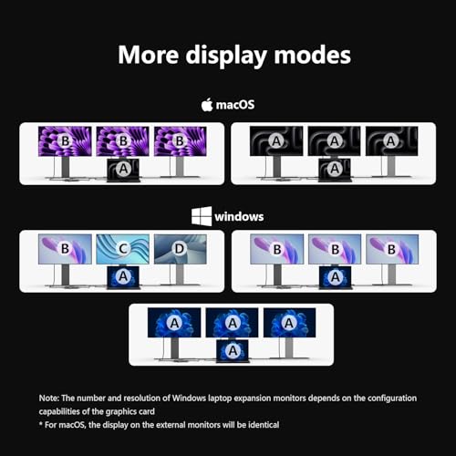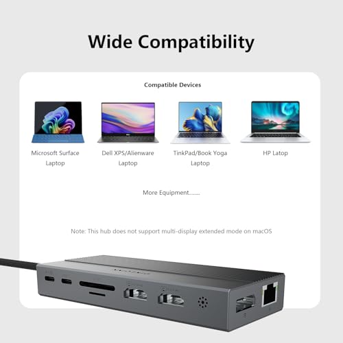 Wide compatibility, easy synchronization with USB-C 3.1 laptops, such as ThinkPad Book, Dell XPS 13, MacBook Pro M3 Pro, etc. For Windows 10 and later and macOS 12 and later. Note that when displaying on up to four separate screens at the highest resolution, use a Windows laptop, depending on your laptop's graphics card configuration. This DIKEQINN docking station does not support screen mirroring via the USB-C port and is not compatible with Switch or SuperDrive. The USB-C Power Delivery input supports charging only, and this hub does not support multi-monitor extended mode on macOS.