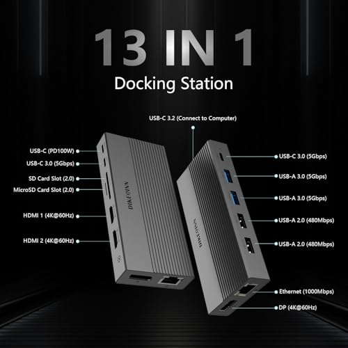 DIKEQINN Docking | 13-in-1 USB C Docking Station Triple 4K Display 100W Power Delivery | Ultimate Connectivity Solution
