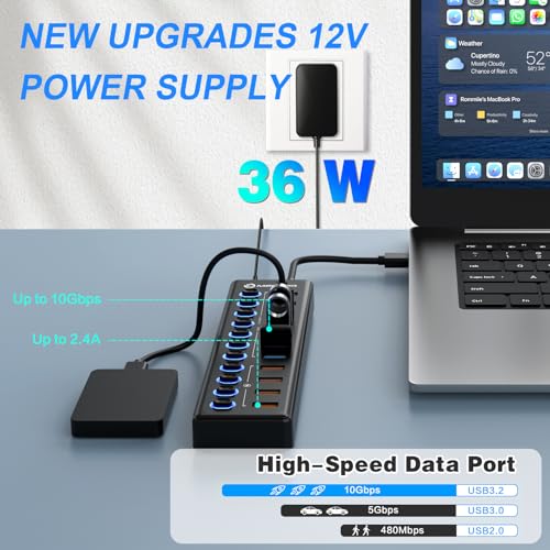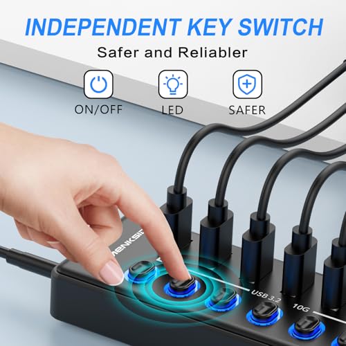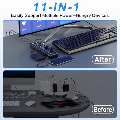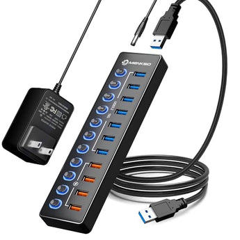 Experience the ultimate in connectivity and convenience with the MENKSID 11-Port Powered USB Hub, designed to meet the demands of modern devices. As a premium solution for MacBook Pro and iPad users, this USB 3.2 hub offers 7 high-speed data transfer ports and 4 smart charging ports, ensuring all your devices stay connected and powered up. With an independent switch and LED power indicator, you can easily manage your devices and monitor power status. This high-end USB hub is compatible with Mac and PC, and comes with a power adapter for reliable operation. Whether you're looking for a top-tier powered USB hub, this device is the perfect choice. Transform your single USB port into a powerhouse of connectivity with this versatile 7-port USB 3.2 hub. Each port features individual on/off switches with LED indicators, giving you complete control over your connected devices. The generous 3.3-foot cable provides flexibility in placement, while the USB 3.2 technology ensures swift data transfer speeds. This hub is thoughtfully designed to be universally compatible with a wide range of devices including laptops, PCs, MacBooks, Mac Pro, Mac Mini, iMac, and Surface Pro. Perfect for both home office setups and professional workstations, this hub helps eliminate the frustration of limited USB ports. The individual switches allow you to manage power distribution efficiently, and the LED indicators provide clear visual feedback of active connections. Whether you're connecting multiple peripherals, storage devices, or charging your gadgets, this hub streamlines your digital workspace with reliable performance.