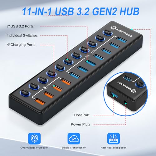 Powered USB Hub | MENKSID 11-Port USB 3.2 Hub with 7 Data Transfer Ports and 4 Smart Charging Ports | Universal Compatibility for Mac and PC