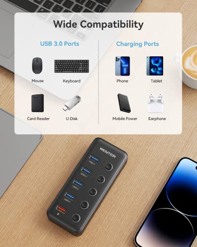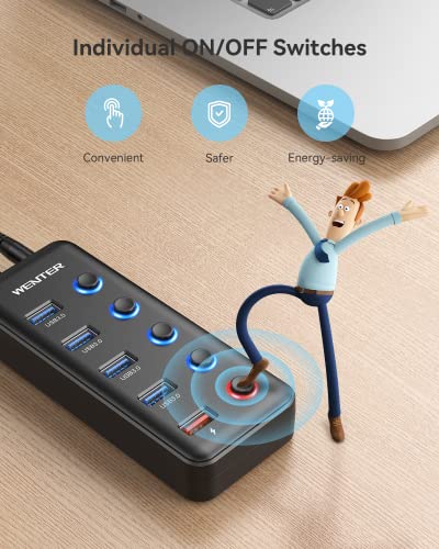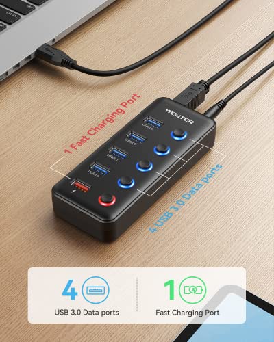 Powered USB Hub | Wenter 5 Ports USB 3.0 Hub | 15W Power Supply for PC and MAC