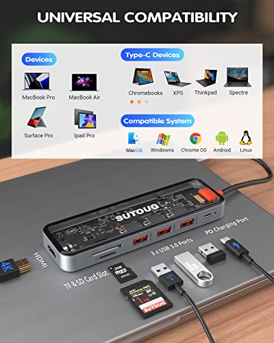- The Sutoug 7 in 1 USB C Hub boasts a sleek and sophisticated design, ensuring seamless integration into any workspace while guaranteeing durability and high-performance.