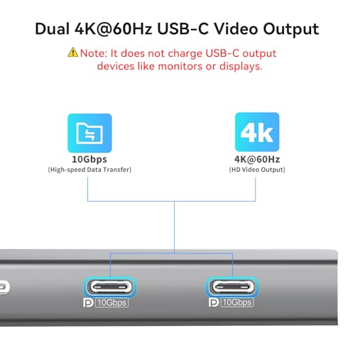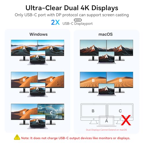 The VANGREE USB C Hub expands a single Type-C port to 2USB-A, 2USB-C 3.2 10Gbps ports, 2USB-C displayports (4K60Hz, 10Gbps data transfer), 100W power delivery port, RJ45 Gigabit Ethernet, and SDTF card slot. This USB-C dock has two 4K60Hz USB-C displayports to meet your need for extended dual monitors. The laptop USB C port must be USB4 or Thunderbolt 4, and the monitors must support USB C Alt mode. Windows system supports MST and SST (Mirror mode A-A-A and Extend mode A-B-C A-A-B A-B-B). MacOS supports Mirror mode A-A-A and Extend mode A-B-B.