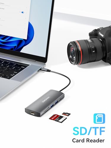The Compact Design USB C HDMI Adapter is compact and lightweight, easy to carry. The premium aluminum case design makes this hub durable to use. The built-in SD and TF slots easily access files from universal SD card and Micro SD card. The speed of Read 50-104MBs and write 30-80MBs allows for quick transfer of large files, increasing users' productivity. The compact size and MAC-style design make this hub perfect for extending your laptop's capabilities while on-the-go.