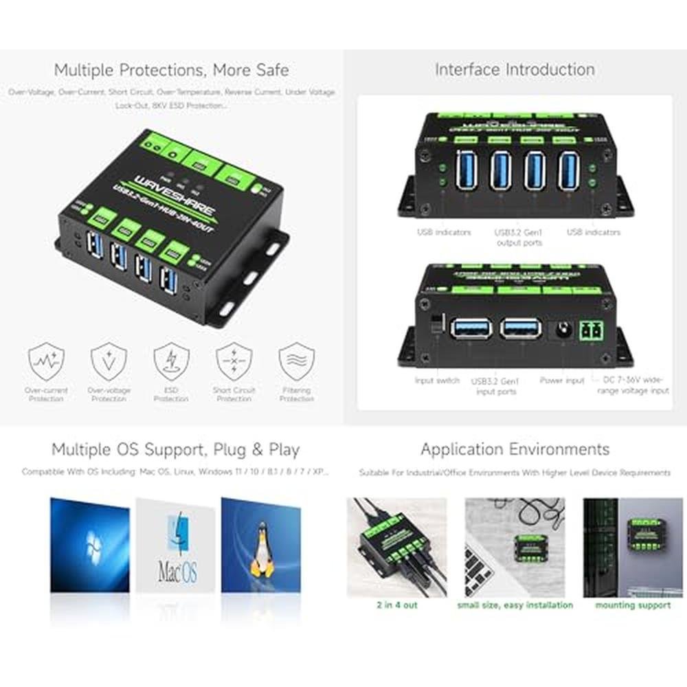 Waveshare Industrial Grade USB HUB, Extending 4X USB 3.2 Ports, Switchable Dual Hosts, Multi Protections