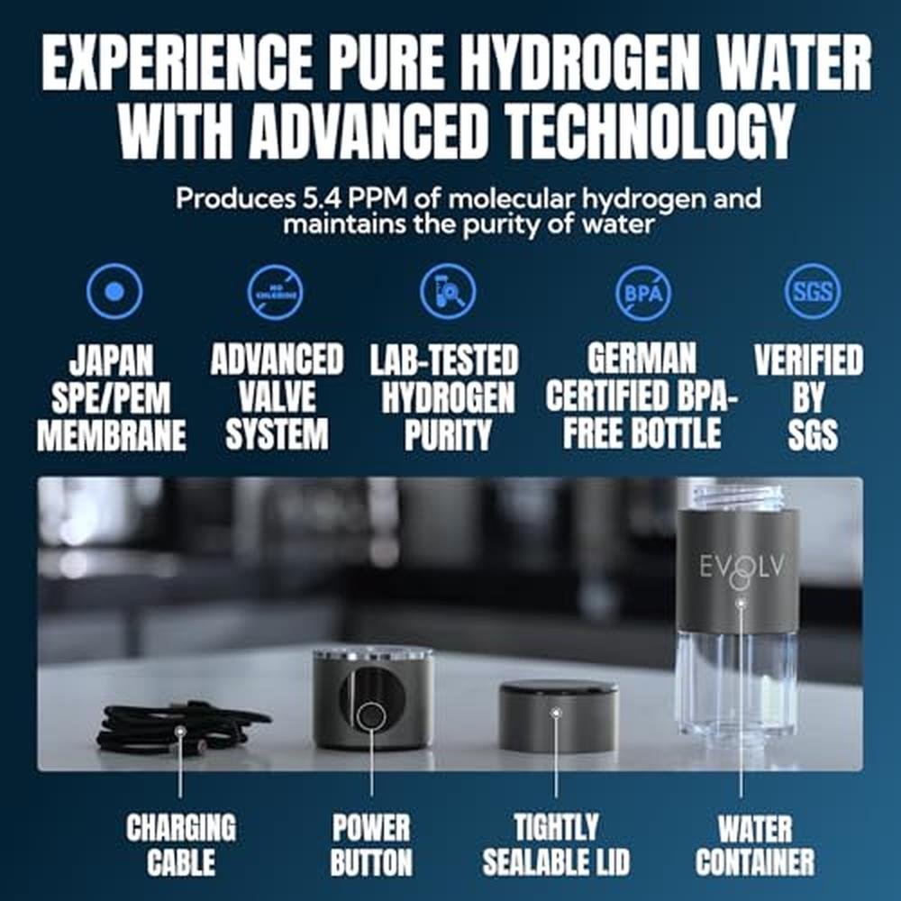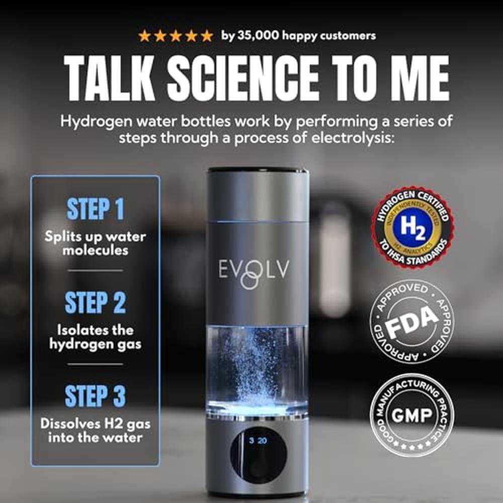 Discover the Power of Hydrogen Water with the EVOLV Hydrogen Water Bottle Generator The EVOLV hydrogen water bottle is designed to revolutionize your hydration routine. With advanced technology and precision engineering, this hydrogen water bottle generator delivers the purest form of hydrogen water, supporting your overall wellness. Whether you're an athlete, a biohacker, or simply health-conscious, this hydrogen water machine is your go-to solution for premium hydration and mental/physical recovery. Why Choose EVOLV? 5x Hydrogen Concentration: Our hydrogen water generator produces up to 5PPM of hydrogen, giving you more in every sip. Tested for Safety: Rated for 150 PSI and tested with gas chromatography, this hydrogenated water bottle ensures quality and performance with advanced ventilation & filtration. High-Quality Construction: Made from durable, food-grade polycarbonate, the EVOLV 8oz hydro water bottle is built to last. How It Works The EVOLV hydrogen water bottle uses advanced electrolysis technology to infuse your water with molecular hydrogen. This water ionizer splits water molecules into hydrogen and oxygen, and the release valve safely expels any byproducts, ensuring that you're drinking only the cleanest hydrogenated water. Trusted & Reliable Backed by industry-leading expertise, EVOLV is committed to offering the most effective and trusted hydrogen water bottle generator on the market. Experience the difference with our premium hydrogen bottle water and take your hydration to the next level!