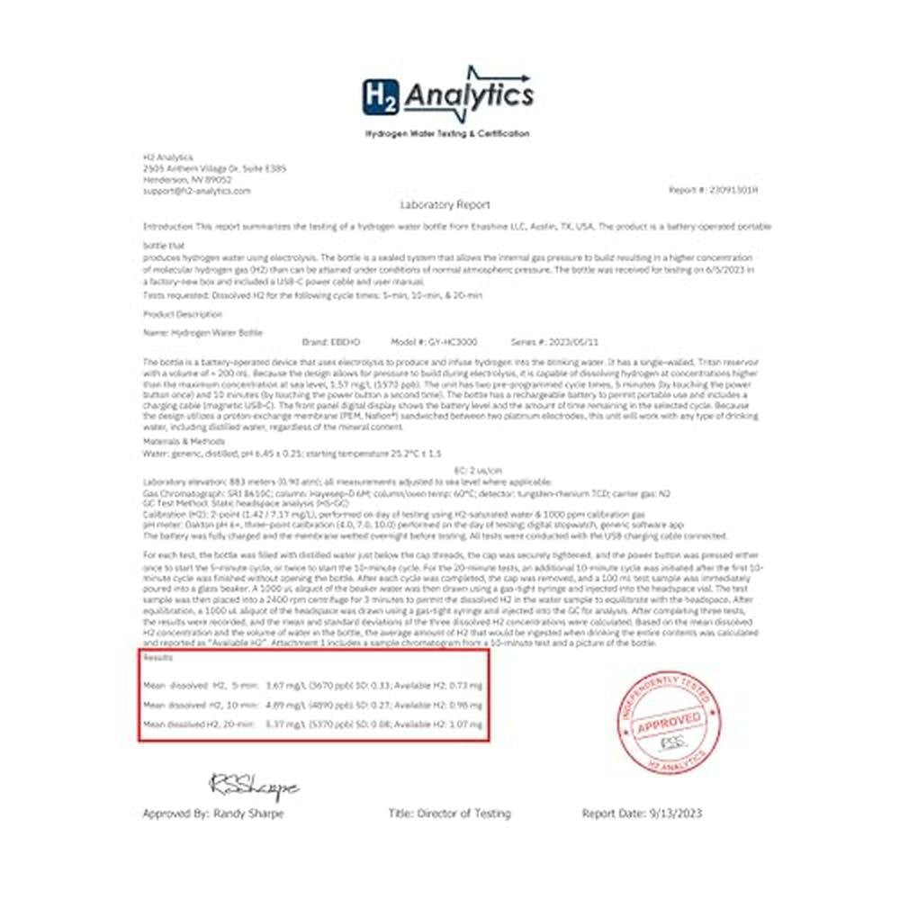 - [Perfect size for you]: 3rd party tested, our hydrogen water bottle is perfectly sized to deliver the highest concentration of hydrogen 5000+PPB, ensuring you get the maximum health benefits in every sip. Unlike larger bottles, which generate less hydrogen in the water, our compact design provides optimal absorption, giving you the full power of hydrogen-rich water. Plus, you dont need to replace your regular drinking water with hydrogen water; it should be used as an enhancement to your hydration routine.