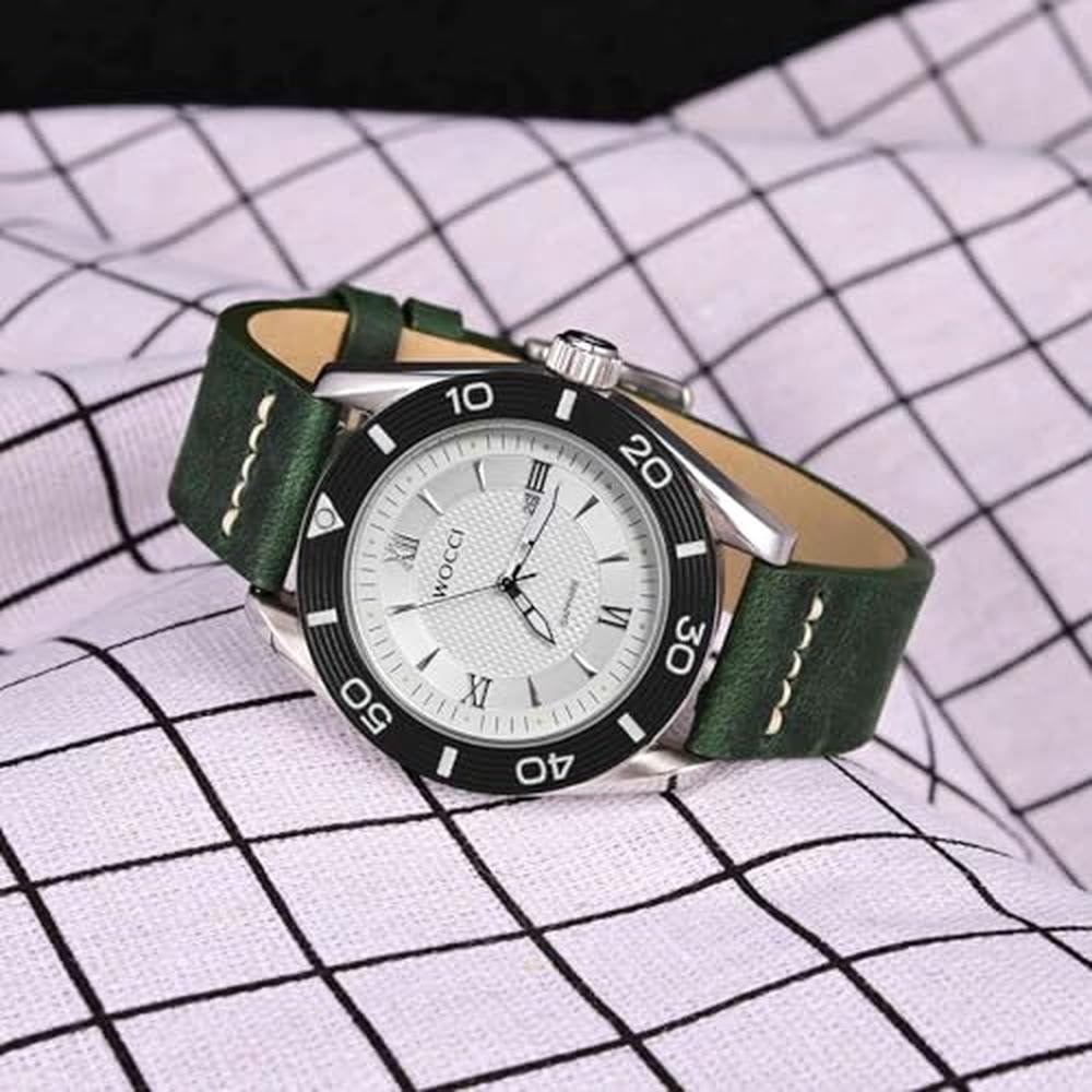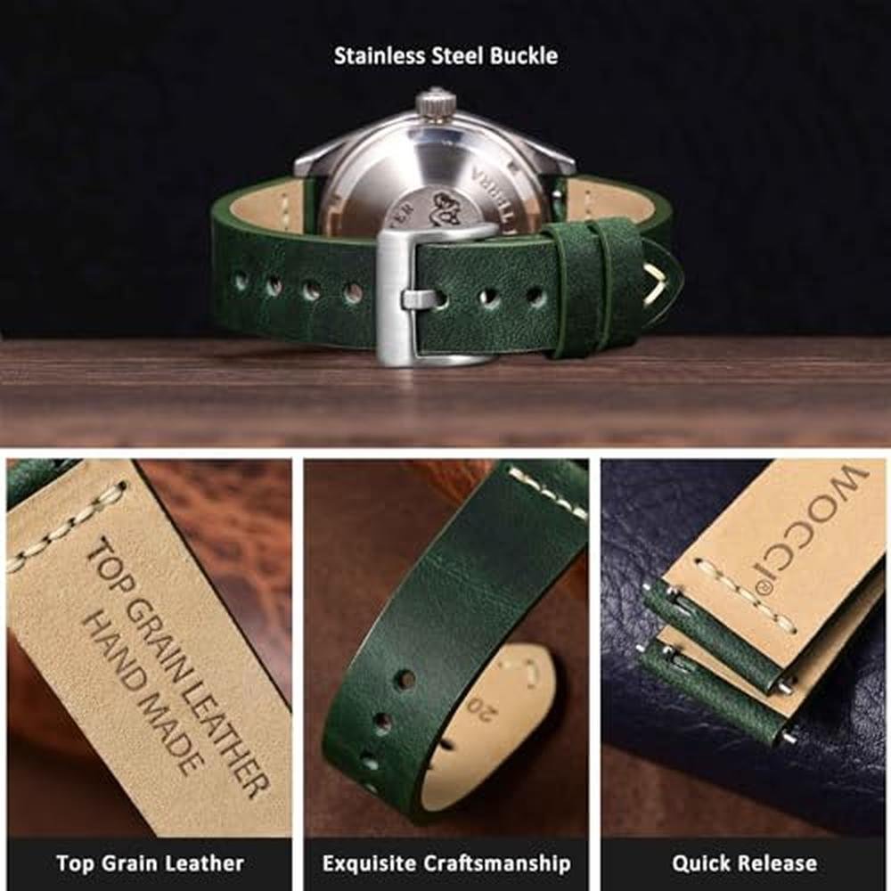 WOCCI 21mm Old-fashioned Watch Band for Men, Top Grain Leather, Silver Brushed Buckle (Army Green)