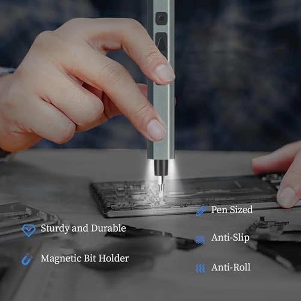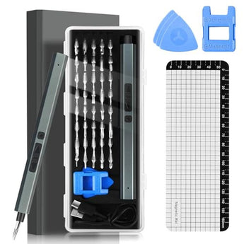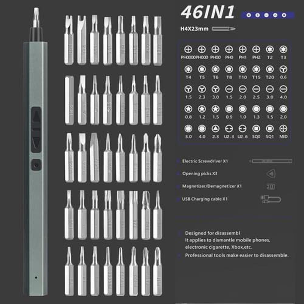• 46-in-1 Multi-functional KitThis electric screwdriver set includes 46 precision accessories, 1 magnetic mat, 3 triangular plastic sheets,1 magnetizer/demagnetizer and a USB charging cable. Covering a variety of bits and practical tools, making it ideal for home repairs, electronic assembly, and more. It meets all your diverse needs with ease.