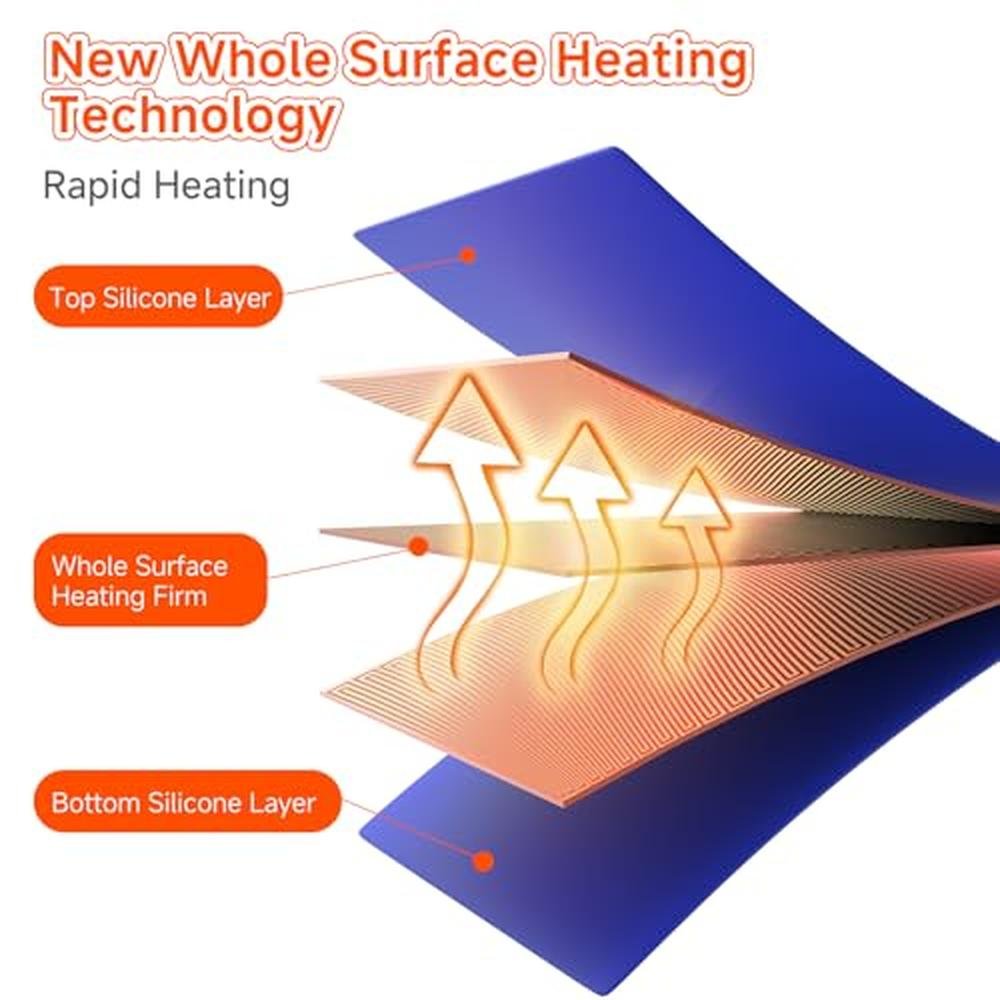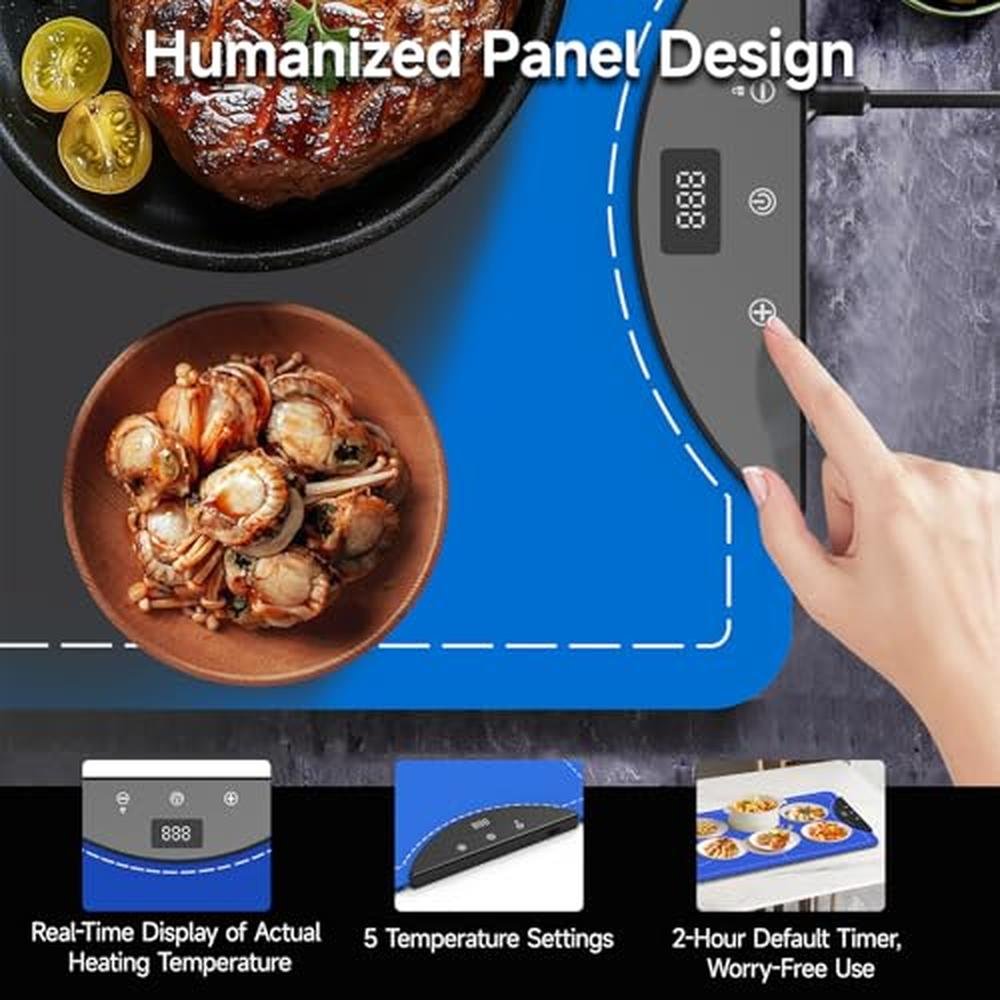 • Adjustable 5-Level Temperature ControlThis silicone food warming mat providing 5 temperature levels from 122 to 194 (Real effective temperature, not falsely labeled), The display on the panel honestly shows the real-time and real effective heating temperature.