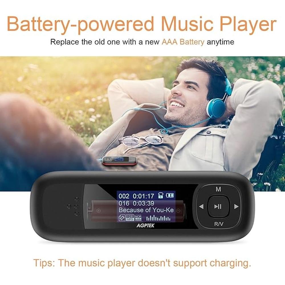 - REPLACEABLE BATTERY Never worried about power, replacing at any time with 1 AAA Battery(Not included). Battery capacity of different brand may influence the battery life of the player. DONt support charge via USB and only replace batteries.