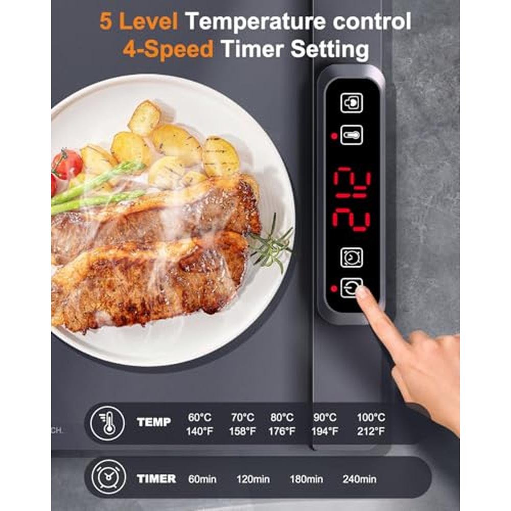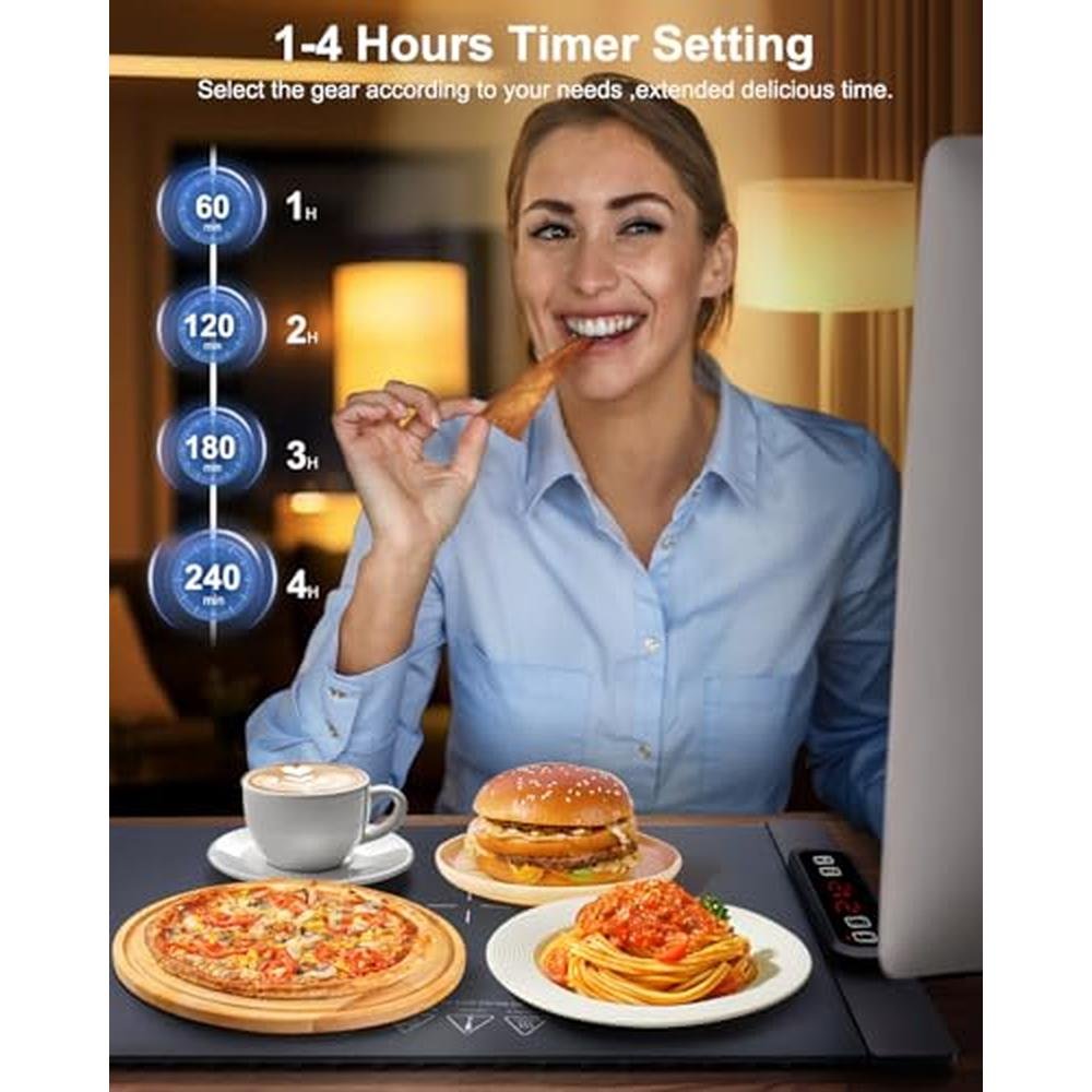 - [ Adjustable temperature & Timer ] -- Upgraded silicone warming mat provides 5 adjustable temperatures from 140 to 212 , ensuring that food is kept warm at the optimal temperatur. In addition, it has 4-speed (1-4 hours) timer mode, with accurate counting minute by minute. You can choose the gear according to your needs to extend the delicious time.