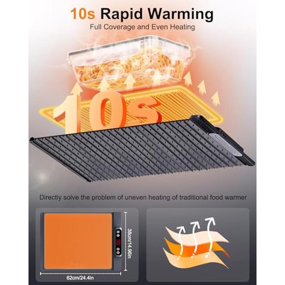 - [ Fast and even heating ] -- Our food warming mat has a graphene heating film installed inside and can heat quickly at 300w. It only takes 10s to achieve uniform heating and rapid heat transfer on the entire surface, solving the problem of uneven heating of traditional electric warming tray and allowing more tableware to be placed freely. Heating Area: 14.57in * 21.65in.