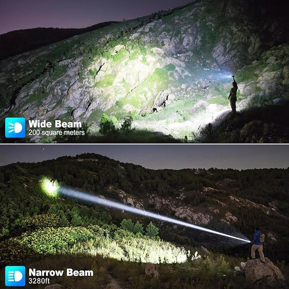 • Adjustable Light DistanceThis powerful flashlights can switching between in wide beam and narrow beam. The wide beam Lighting, provide you with bright and wide vision when you walk at night, dispel the darkness and provide you with a full sense of security. the narrow beam lighting for long-range observation, max beam range to 3280ft, accurately help you detect the field of vision, allows you to see objects in the distance more clearly.