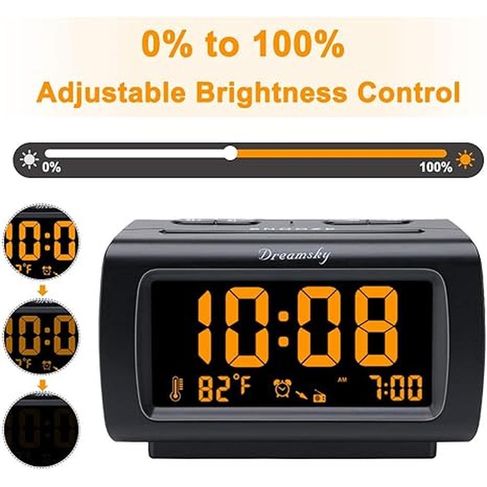 - Electric Digital Alarm Clock with Full Range Dimmer 4 Inches large LCD screen with eye easy catch orange number display, time and content are easy to read at a glance. 100-0 completely adjustable display brightness for comfortable viewing. 12 or 24hr switch, Indoor temperature ( or ) Display.