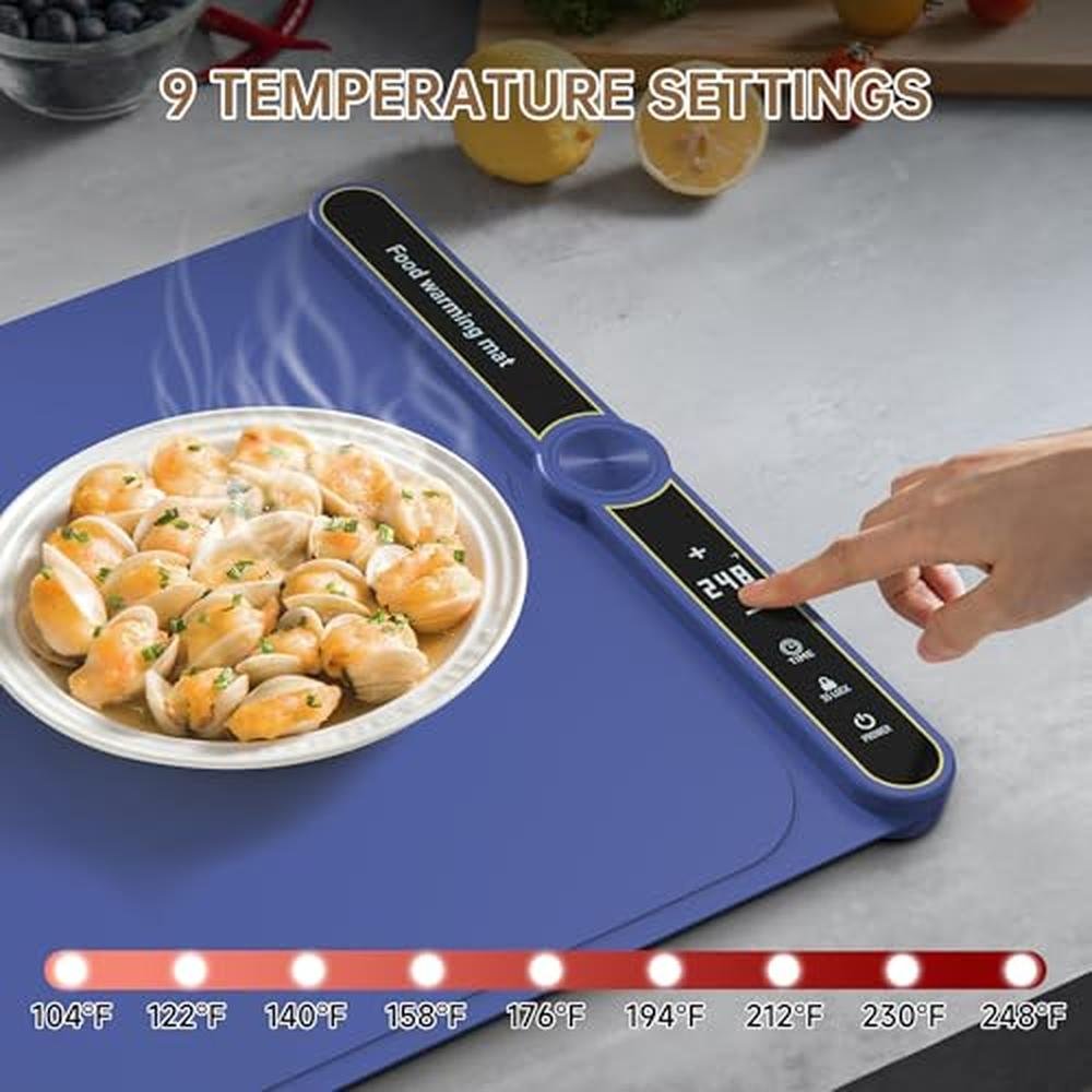 • Child Lock and Safety Protection Device: silicone warming mat considers more details, not only has 9 adjustable temperatures (104F - 122F-140F -158F- 176F -194F- 212F-230F-248F), but also has a child safety lock (to prevent accidental touch, long press for 3 seconds to take effect and remove) and a timer (1-6 hours)