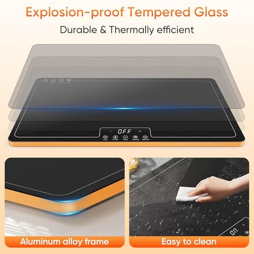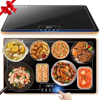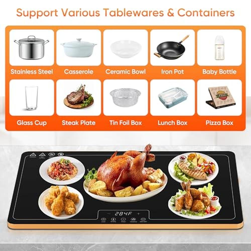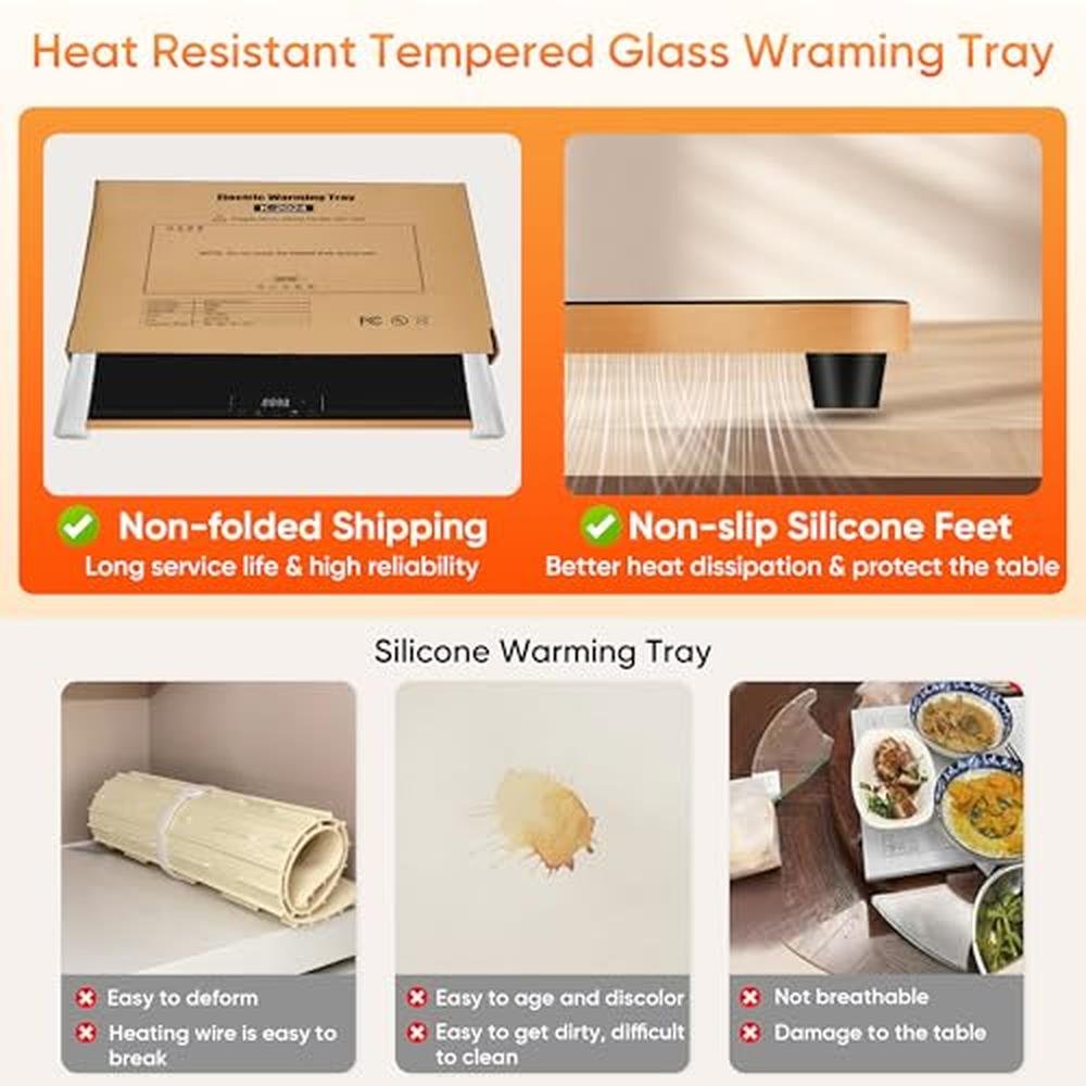 - Upgraded Durable Material- Our warming tray panel is made of heat-resistant explosion-proof tempered glass and aviation-grade aluminum alloy frame, making the food warming mat very sturdy. The one-piece body design avoids bending damage to heat generating components, and the touch buttons last up to 100,000 times for durability.