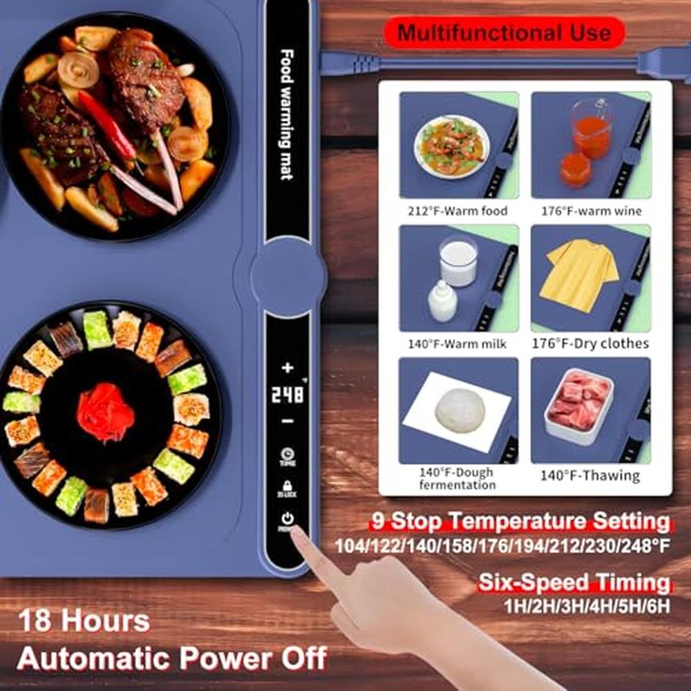 - 9-Level Temperature & 6 Timer Settings:With our intuitive 9-level temperature control feature(104F-248F), our food warming mat are equipped with a 1-6 hours 6-speed timer function. For added safety, the tray shuts off automatically after 18 hours of inactivity.you can effortlessly maintain your food at the ideal temperature, elevating your dining experience.