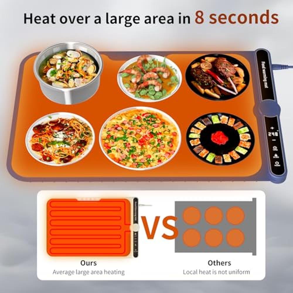 - 8s Fast and Even Heating: Quickly heat your dishes in just 8s! Our advanced technology ensures the full-surface heats up the food at a constant temperature, directly solves the problem of uneven heating of traditional electric warming tray. Empowering you to arrange your tableware with ease.