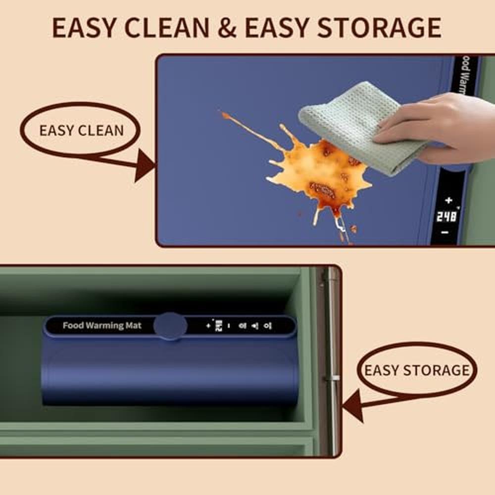 - Easy to Clean & Organize: Our food warming mat nano-coating surface resistant to splashes, oil, stains are cleaned with a single wipe, no hassle cleaning after meals.One roll, one bundle, tidy and save space, very portable.Great for the kitchen.
