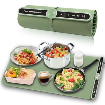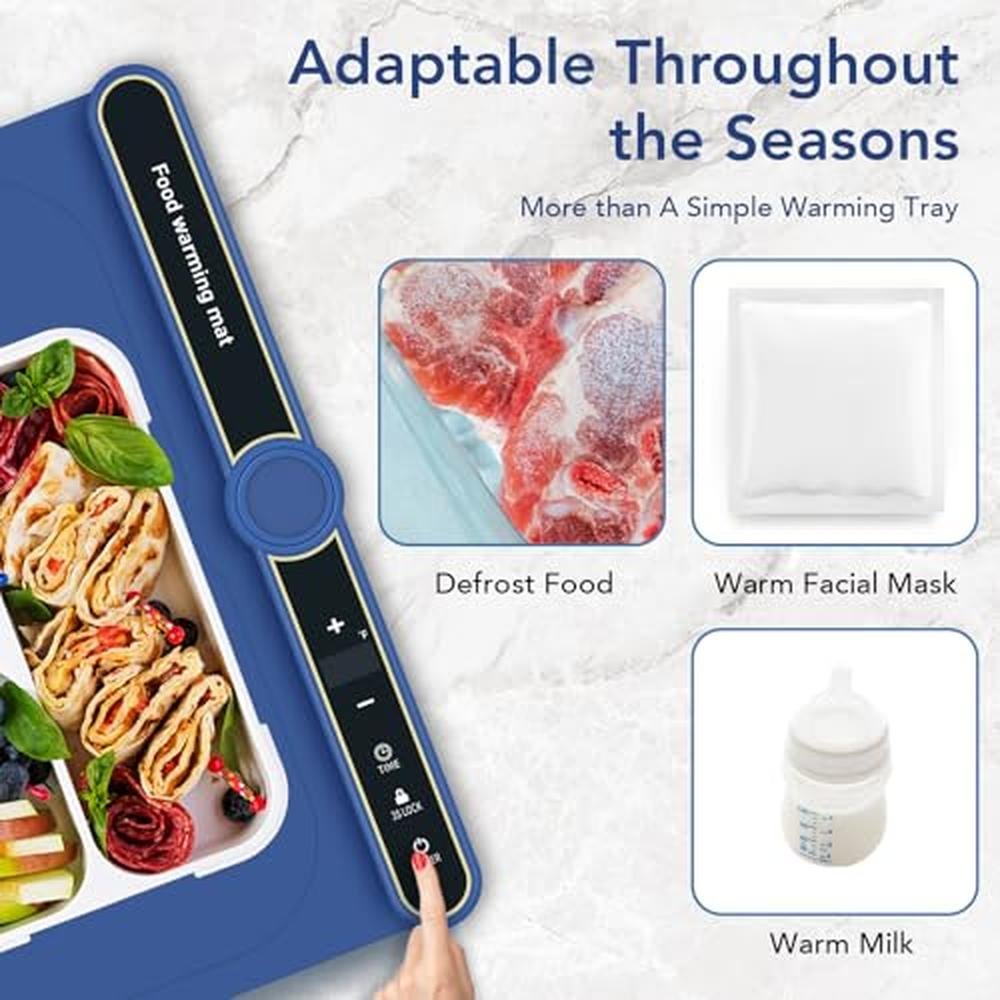 Food Warming Mat,designed to deliver 8-second rapid heating and even warmth across its full-surface silicone mat. Its universal design accommodates large and small plates, making it ideal for buffet food warmers for parties or cozy family dinners.Precision meets versatility with 9 adjustable temperatures and a 6-hour timerperfect for delicate tasks like warming mats for sourdough starter, defrosting meats on a thawing tray, or keeping chafing dish buffet sets steaming hot. Use it as a bread warmer for fresh rolls or a fermentation heating pad for homemade dough. The auto-shutoff and child lock ensure safety during prolonged use, whether placed on a countertop mat or packed as a portable food heater for travel.This rollup electric warming mat resists spills, oil, and stainswipe clean in seconds! Its compact, odorless design rolls up for storage, replacing bulky buffet warmers for parties or disposable chafing dish sets. Compatible with hot plates, silicone trays, and even heated coasters, it doubles as a warming pad for defrosting or a dough warmer for bakers.From hosting party essentials like buffet servers to everyday home & kitchen tasks like keeping food warm for hours, this tray is a cool home gadget with endless uses. Pair it with silicone hot pads or heat-resistant mats for added safety. Compact, lightweight, and energy-efficient, its perfect for travel hot plates, brunch setups, or as a TikTok-worthy kitchen upgrade.
