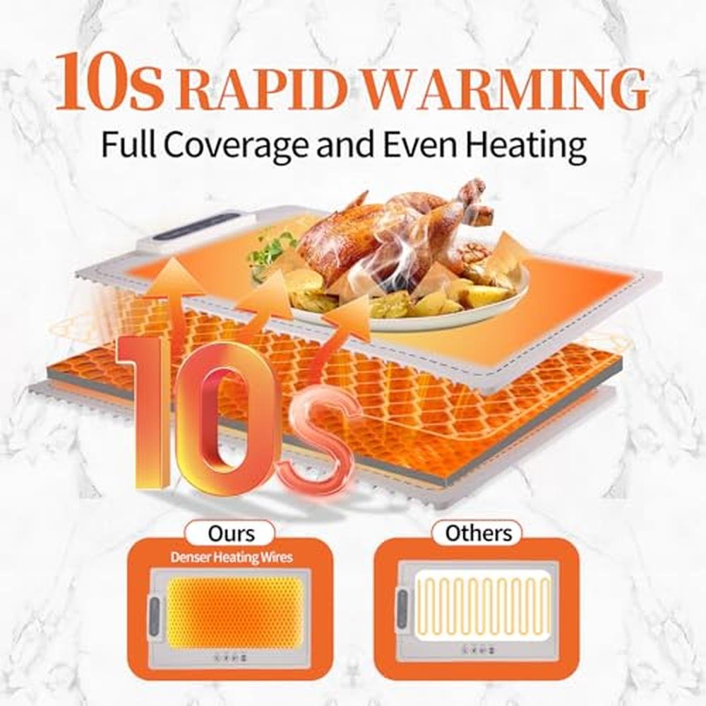 - PREMIUM QUALITY NANOSILICONE MATERIAL: This warming tray is made of top quality flexible nano-silicone material which is durable and heat-resistant to ensure a long service life, this electric warming tray material is waterproof, splash-proof, stain-proof and oil-proof, the internal aluminium foil heating membrane ensures even heat distribution across the entire surface, which enables rapid heating in less than 10 seconds