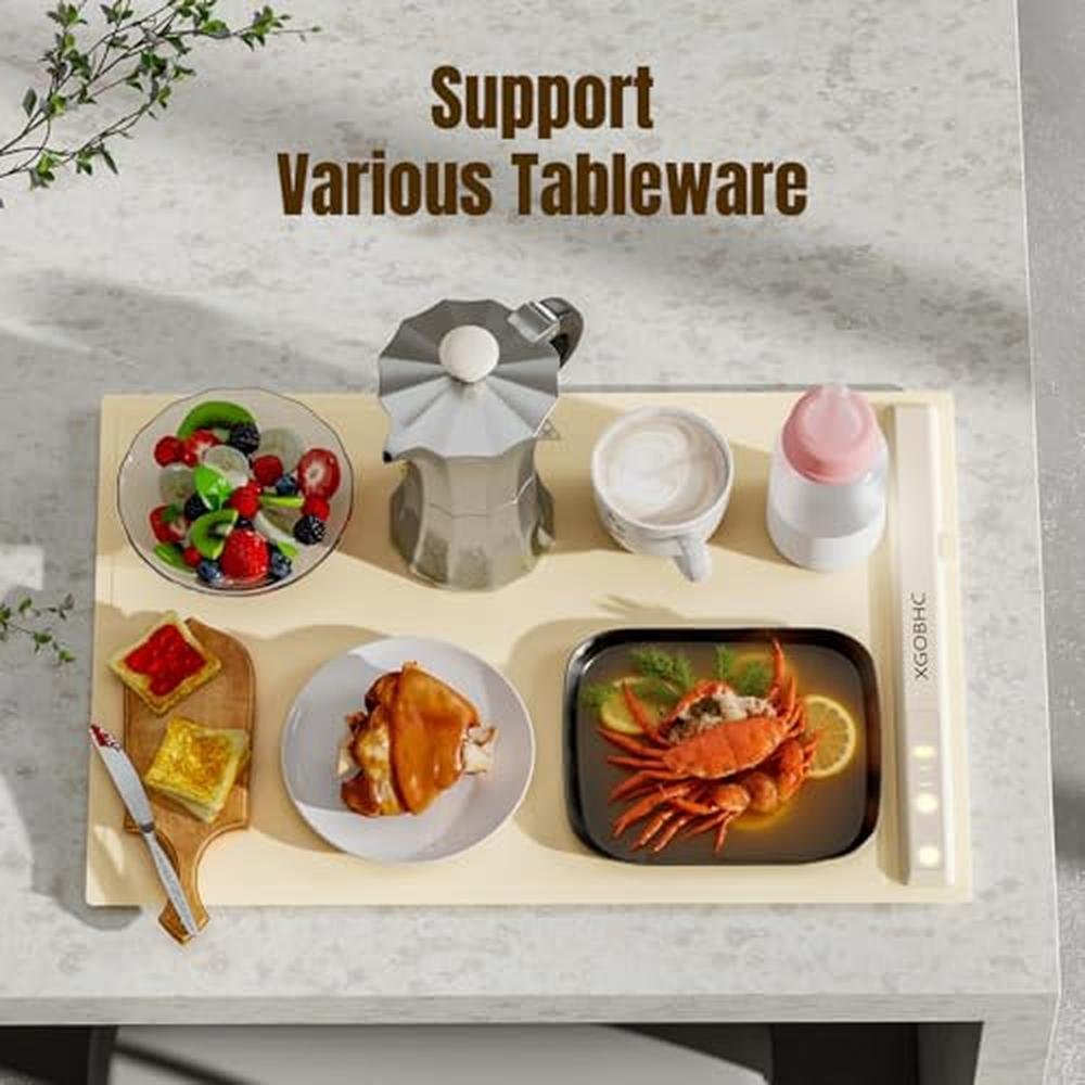 Experience Rapid Full-Surface Heating: Our warming tray boasts a larger heating area with a meticulously arranged extensive heating wire, ensuring even and rapid warming. Arrange your tableware freely as your dishes warm up effortlessly.Rollable, Portable, and Easy Storage: Effortlessly roll up our warming tray for compact and portable storage an ideal solution for those on the go. Store it in a bag with ease, maximizing flexibility and minimizing storage space.Premium Silicone Nano Material: Embrace the excellence of flexible silicone nano material. The panel, carefully selected for its durability, is resistant to splashes, stains, and oil, providing a foldable and crease-free solution for storage.Powerful Heating: No more waiting our warming tray heats up in just 10 seconds, ensuring your dishes stay warm and inviting.3-Level Temperature Control: Enjoy the convenience of three temperature settings, perfect for both warming and heating, making your dining experience even more delightful.Versatile for All Tableware: Designed for universal compatibility, our warming tray suits various tableware and adapts to different settings effortlessly.Automatic 3-Hour Shut-off: Experience peace of mind with the built-in 3-hour automatic shut-off feature, providing safety and energy efficiency.Perfect for All Gatherings: Elevate your gatherings with this warming tray, perfect for a variety of occasions and scenarios.Energy-Efficient: This warming tray is not just about warmth; it's about energy conservation. Consuming only 0.25 degrees per hour, it's a conscious choice for both your meals and the environment.Warmhearted Details: The slim panel, edge protection against burns, a 1.8m long detachable power cord for versatile use, and a responsive waterproof touch panel every detail is crafted with your comfort and convenience in mind.
