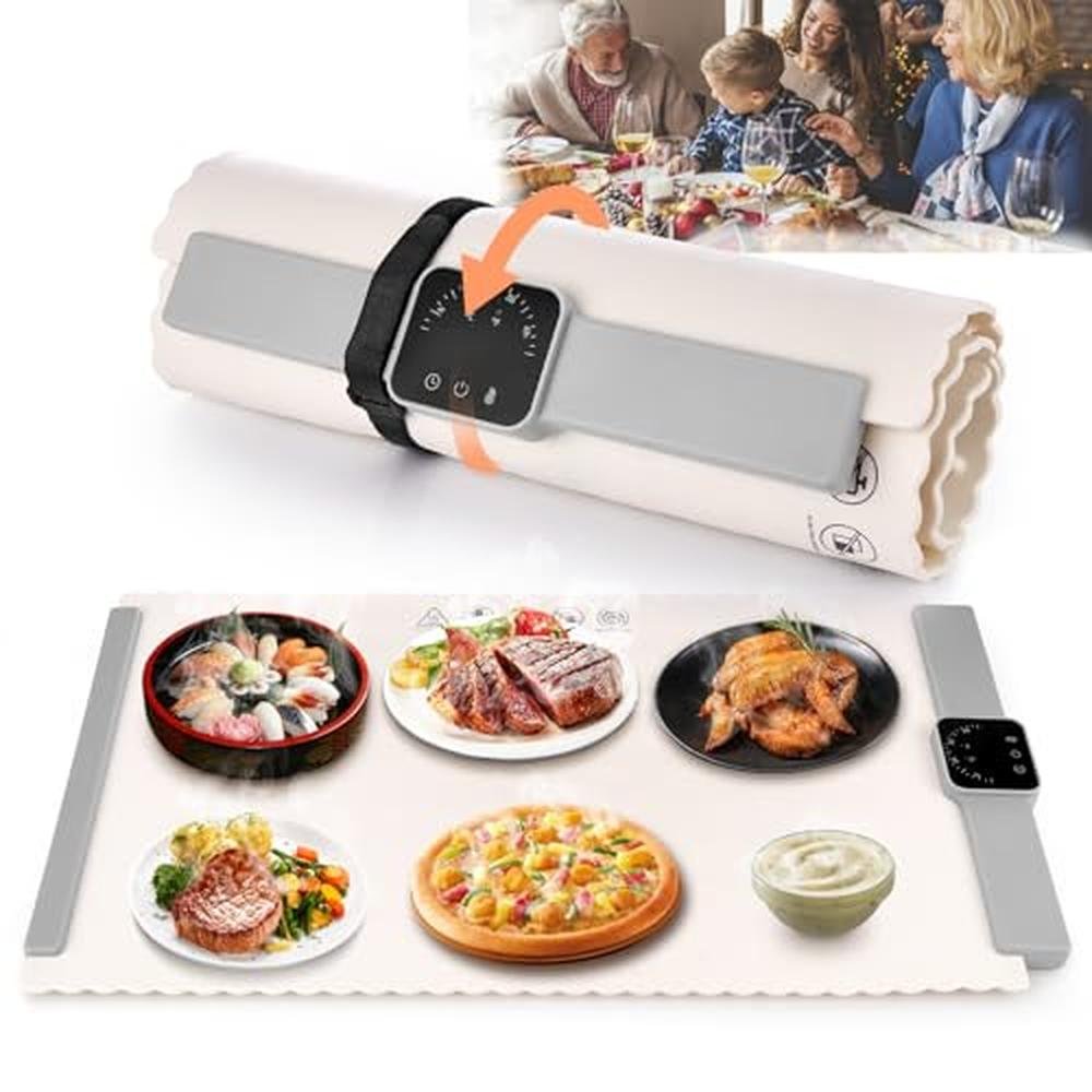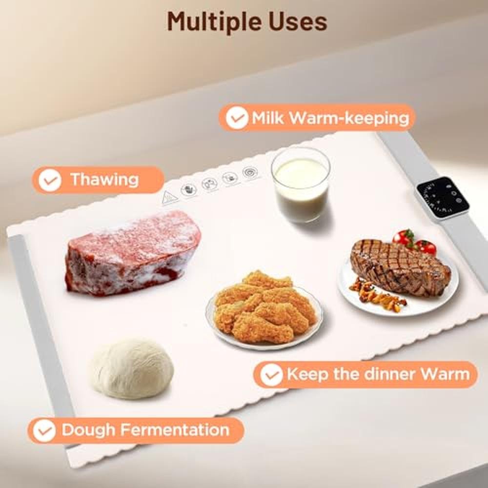 Rapid Full-Surface Heating: Experience rapid and uniform warming across full surface heating area; Electric warming tray designed heating wire ensures quick and even distribution, freely to put your tableware as you like Adjustable 5-Level Temperature Control & Timing function: Enjoy the convenience of precise temperature adjustment to keep food warmer and fast heating for timing a long time; 5-level temperature can adjust your food at the perfect temperature, enhancing your dining experience Premium Silicone Nano-Material: Adopt top-tier flexible silicone nano material to make warming tray offers durability, splash-proof protection, stain resistance, and oil resistance; Without unsightly creases when it has been folded and stored, ensuring lasting quality Convenient Storage & Foldable: Roll-up thermal pad boasts a portable design, allowing for easy rolling and space-saving storage when not in use; Easily folded it in a bag for flexibility and compact storage; when needed, and roll it up effortlessly for storage convenience Versatile Year-Round Use: Beyond serving as a food warmer, our product is a versatile home assistant. Unlock a range of functionalities, from quick defrosting to warming facial masks, drying food and facilitating dough fermentation. Elevate your daily routine with a dynamic warming tray that adapts to your diverse needs throughout the year