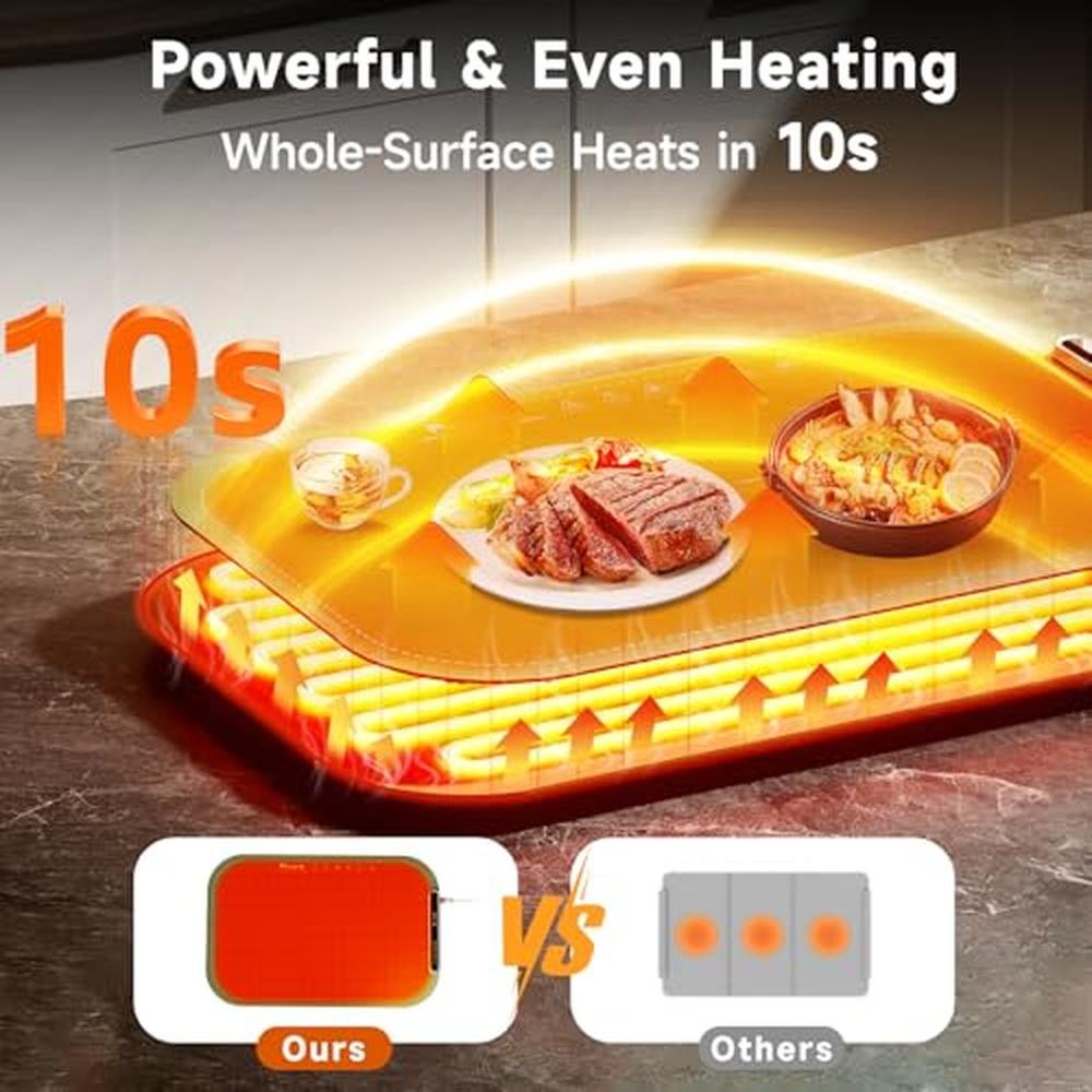 - Electric Wariming Tray-Rapid Full-Surface HeatingThe bottom of the food warming mat is equipped with an intelligent heating wire, and the large heating zone, suitable for heating multiple plates at the same time, ensures that the food warmer distributes heat quickly and evenly to any location. With 3 temperature settings from 140F (60C) to 212F100C, whether you're defrosting food, keeping it warm, or reheating a meal, our warming mat for food will bring you consistent warmth.