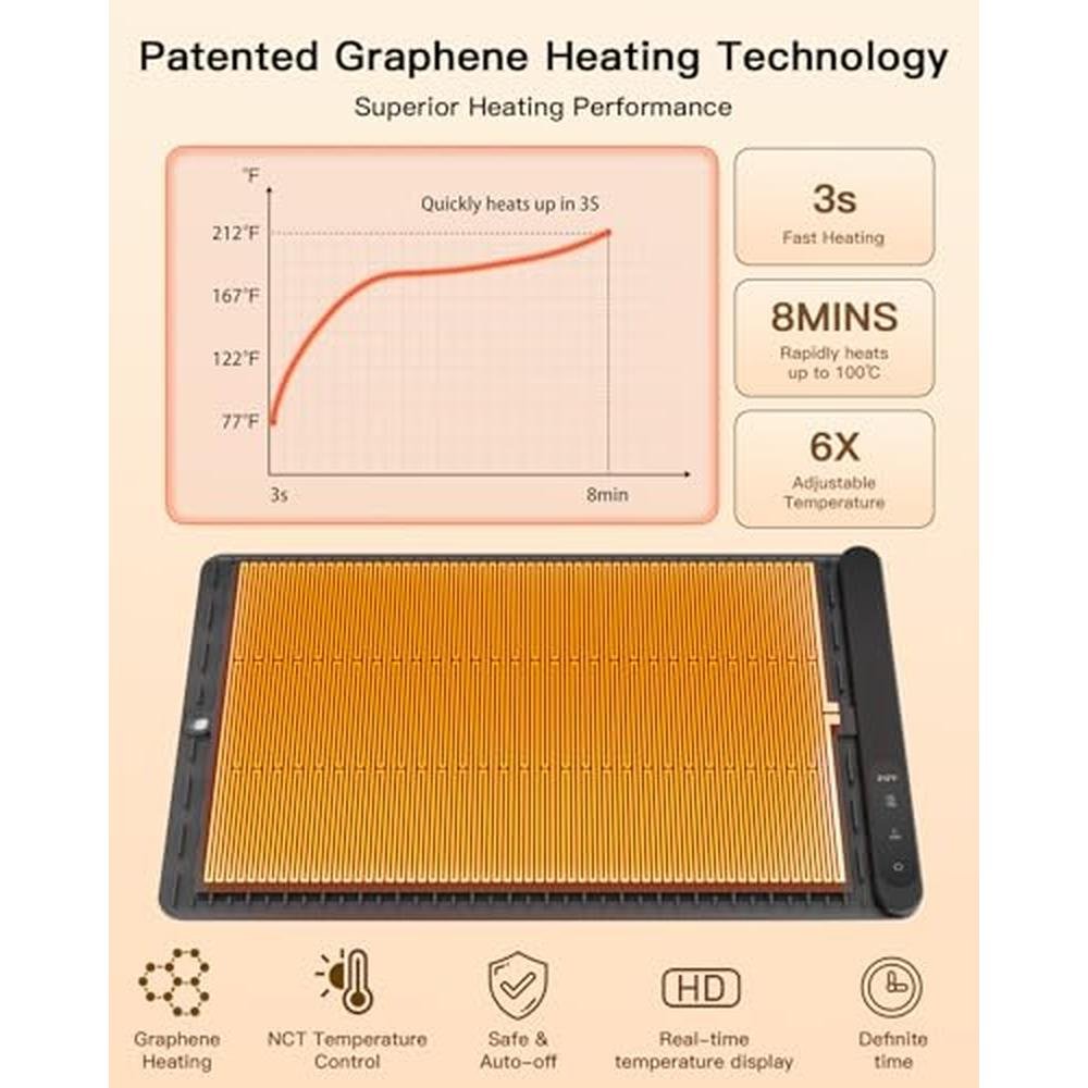 - Whole Surface Heating - HERTIENDO adopt the graphene heating principle, which can generate heat quickly. It is twice as efficient as other products on the market and reduces energy consumption by half.You dont need to deliberately arrange your food to achieve the heating effect, and better utilize the heat to transfer to your food.