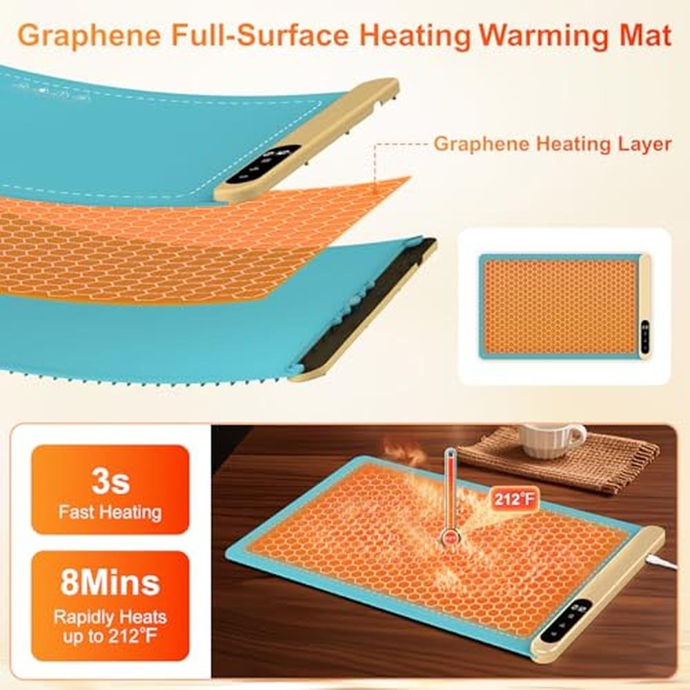 - Graphene Heating Technology: The Kombella food warming mat uses an innovative graphene film that consumes only 0.5 kWh, heats up in 3 seconds, and reaches 212 in 8 minutes for fast, efficient, and even heating. Our Graphene food warmers for parties buffet keeps food at the perfect temperature for family dinners or gatherings, ensuring every bite is warm and enjoyable