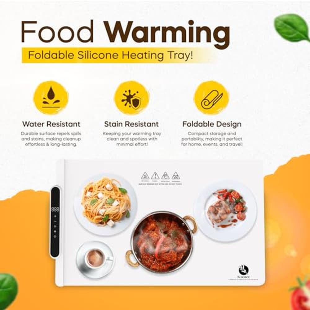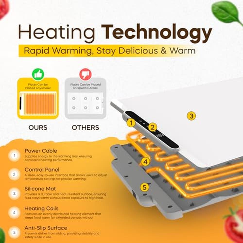 - Premium Quality & Even Heating: Our ALSOBEC Warming Mat Food is crafted from high-quality silicone, ensuring heat resistance and durability for long-term use. The built-in graphene film and double NTC temperature control provide fast, even heating across the entire surface, maintaining a consistent temperature between 50-100C. Perfect for keeping your meals warm efficiently!