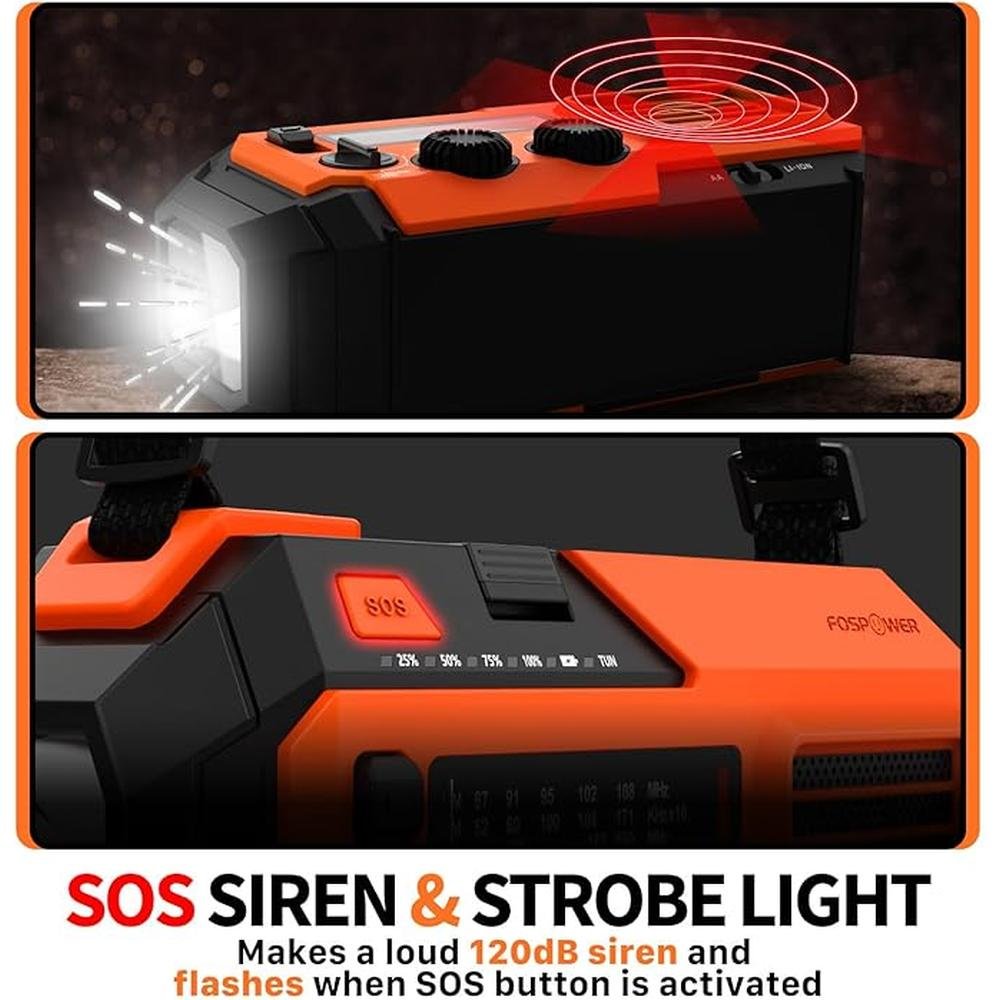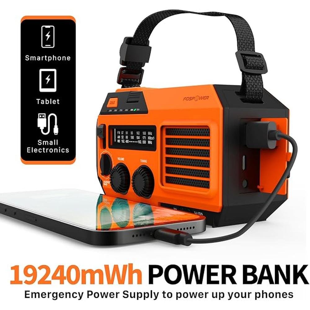FosPower Emergency Weather Radio (Model A6) NOAA/AM/FM with 19240mWh Portable Power Bank, USB/Solar/Hand Crank Charging, Battery Operated, SOS Alarm & Flashlight for Indoor/Outdoor Emergency - Orange