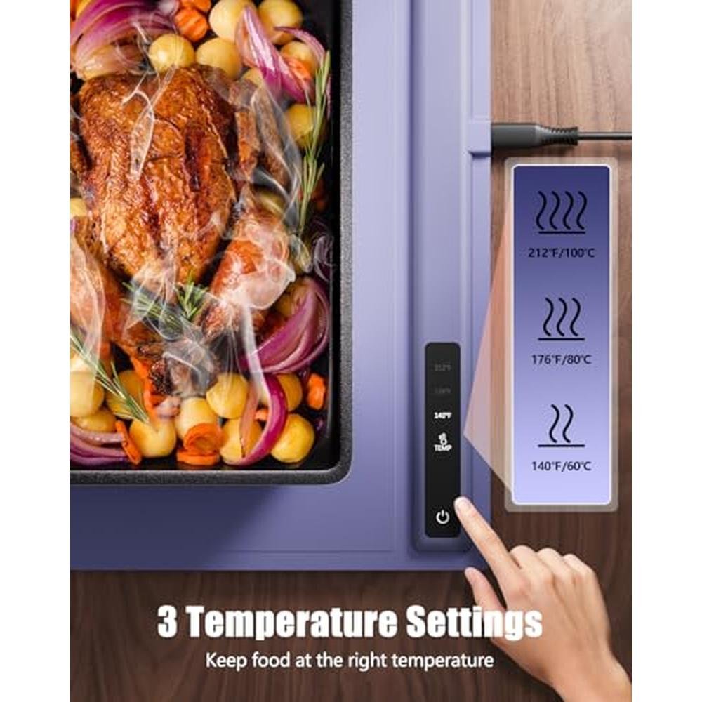 - Three Temperature Settings: With three adjustable temperature settings of 140F, 176F, and 212F, this warming mat for food provides a customized warming experience; Use the low setting for gentle warmth, the medium for ideal serving temperatures, and the high for quick reheating