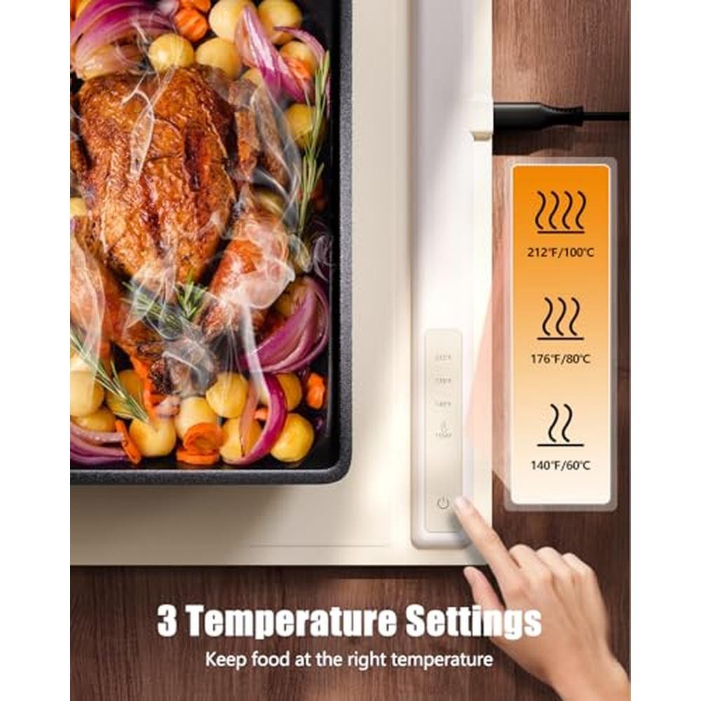 - Three Temperature Settings: With three adjustable temperature settings of 140F, 176F, and 212F, this warming mat for food provides a customized warming experience; Use the low setting for gentle warmth, the medium for ideal serving temperatures, and the high for quick reheating