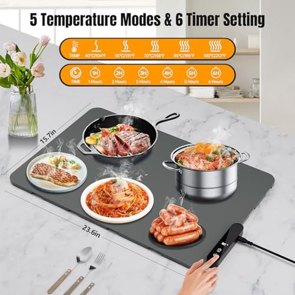 - 5 Temperature 6 Timer Control: PLEASE CHECK THE SIZE:23.6IN*15.7IN. The picture is just to show the beauty of the product, how many plates can actually be placed depends on the specific size of the physical object to measure, please understand. With 5 temperature modes (104F-131F -158F-185F-212F), Time key: Control time shift time has 6 gears, respectively 1H to 6H. Whether you prefer to keep your dishes warm, our tray offers the flexibility to meet your needs.