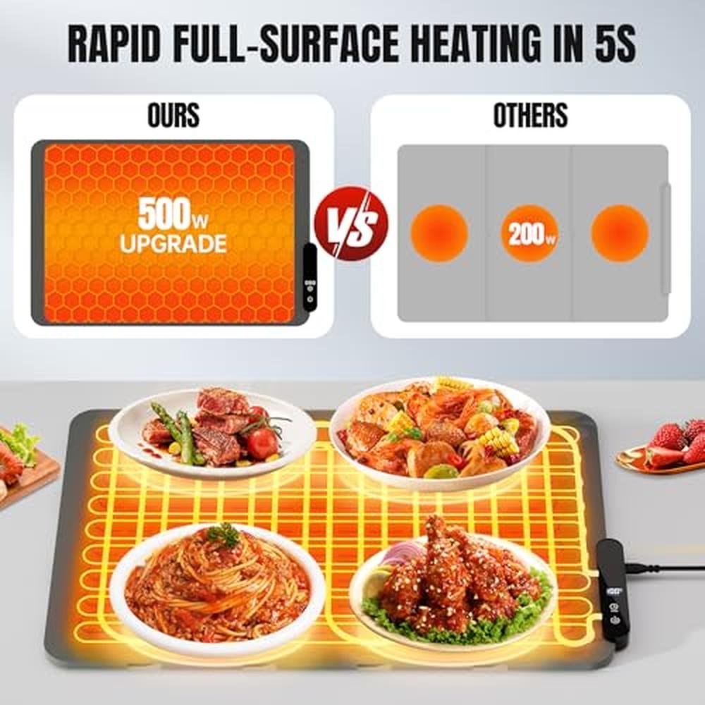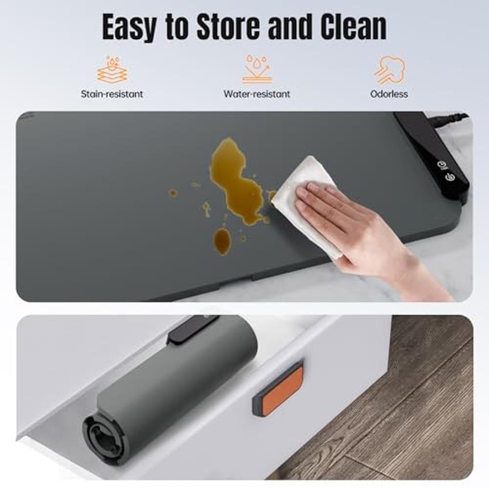 - Compact Rollable Design & Eco-Friendly Efficiency: THE SIZE:23.6IN*15.7IN. Embrace portability with our space-saving roll up design, ideal for storage and on-the-go lifestyles, saving up to 60% more space than traditional models. Crafted with silicone material, this warming plate is not only safe and easy to clean, our electric warming tray offers durability, splash-proof protection, guaranteeing long-lasting performance for daily use. Warm reminder: THE SIZE:23.6IN*15.7IN.