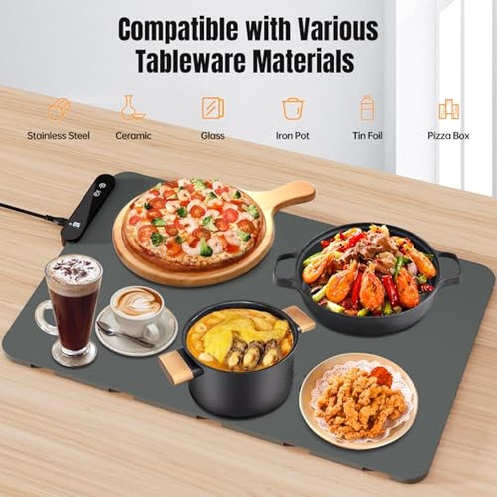 - Compatible with a Wide Range of Tablewares: This Electric Warming Tray can warm food, heat milk, heat coffee and tea, etc. It is compatible with all materials (glass, stainless steel, iron pot, ceramic, casserole and plastic). Stable product performance allows you using it with confidence. (Note:Avoid using the hot tray on the top of tables that can't be used with hot cups and pots to avoid any unwanted marks due to heating.) Warm reminder: THE SIZE:23.6IN*15.7IN.