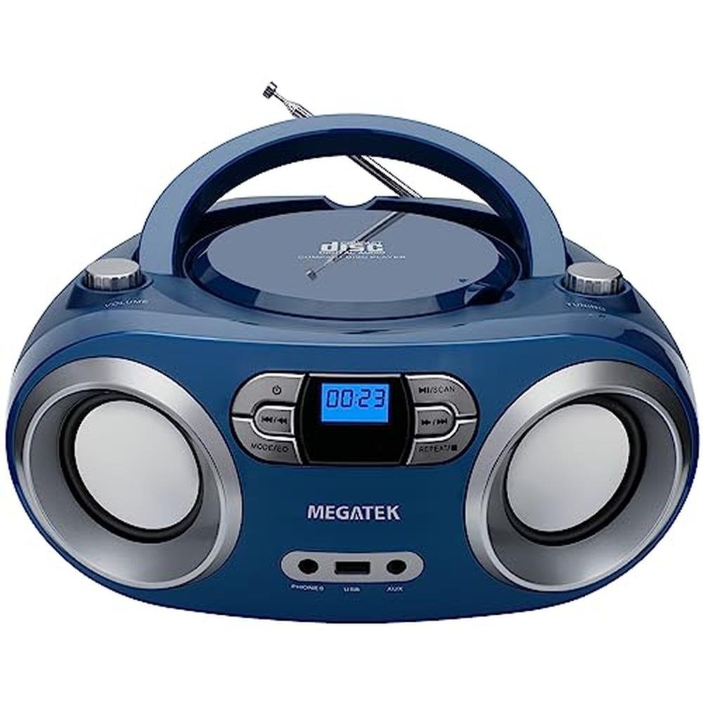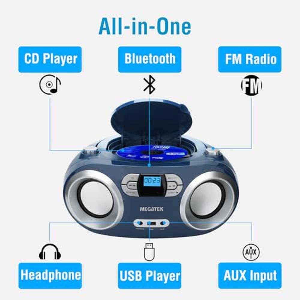 MEGATEK Portable CD Player Boombox with FM Radio, Bluetooth, USB Port, AUX Input, and Headphone Jack, CD-R/CD-RW/MP3-CD Compatible, Clear Stereo Sound, Backlit LCD Display, Blue Jay